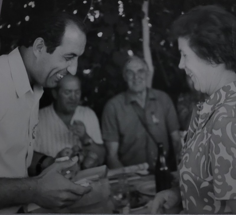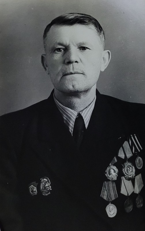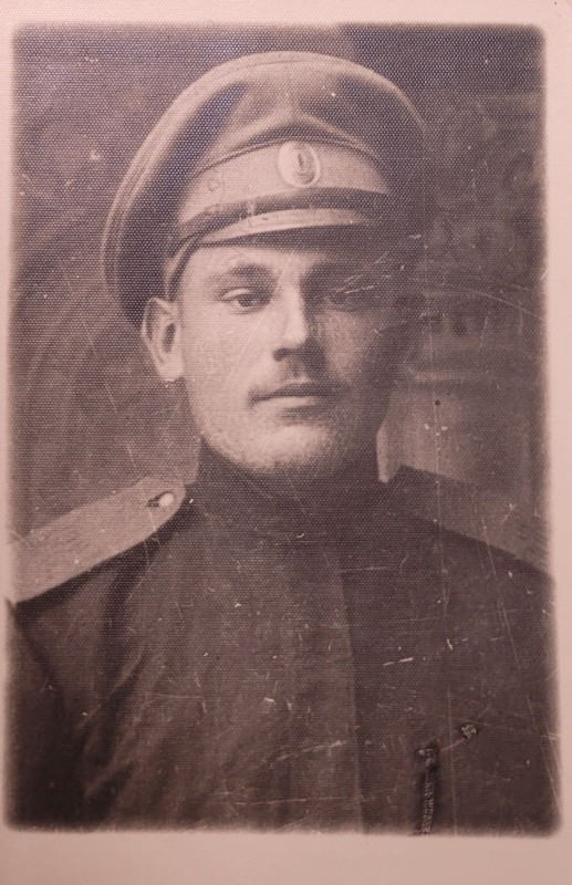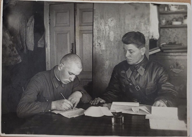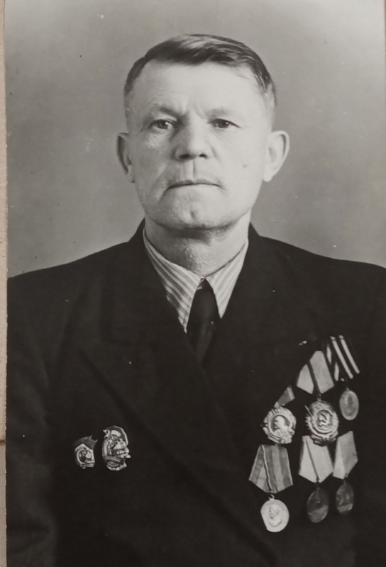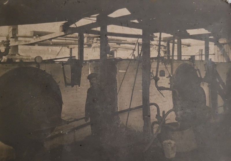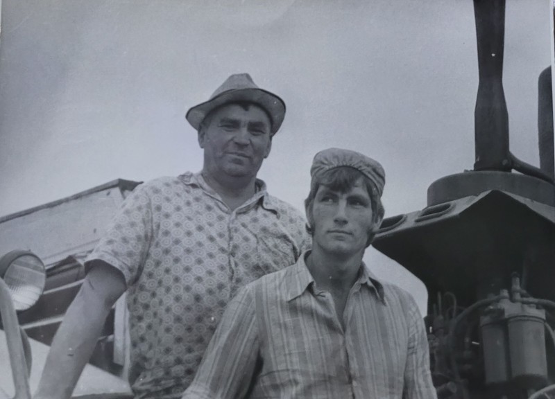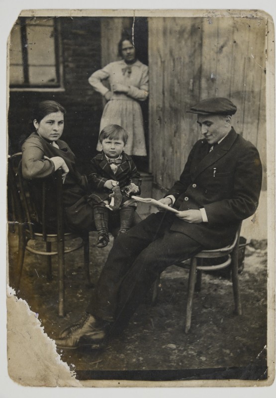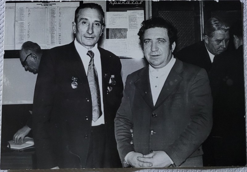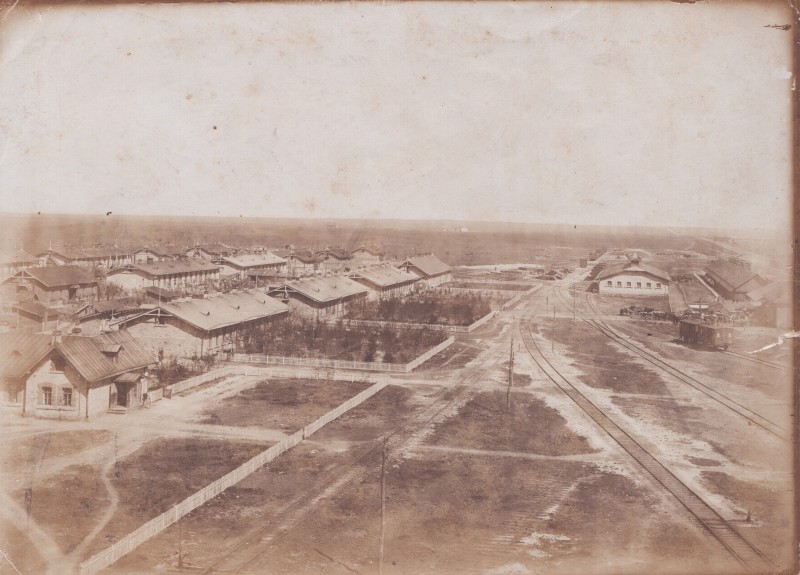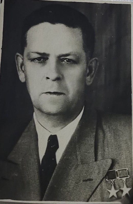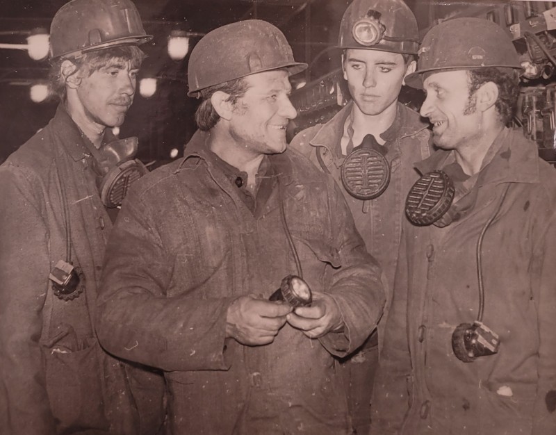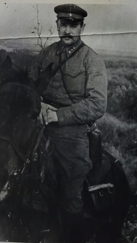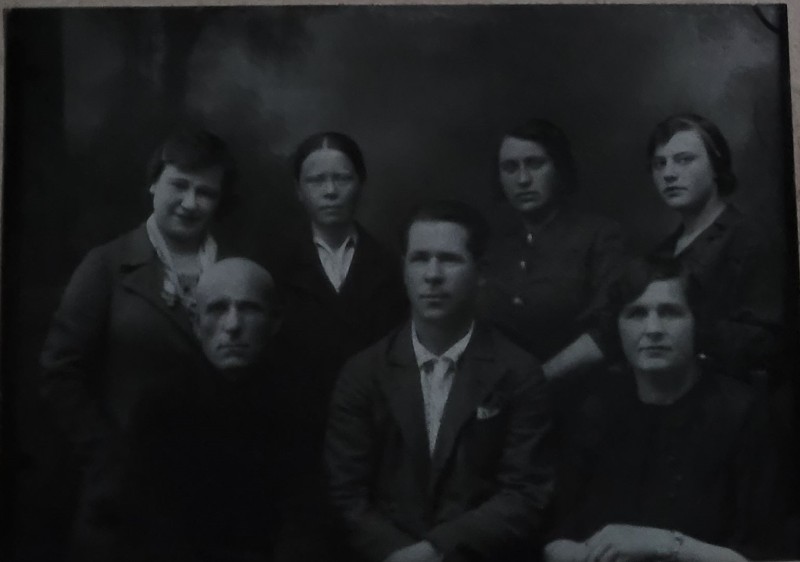 Зображення учнів та викладачів в декілька рядів. Перший ряд – хлопці напівлежачі. Праворуч чорна пляма. На з.п. фрагмент будівлі з двома вікнами. Посередині транспарант з написом білим кольором «1-е Травня».