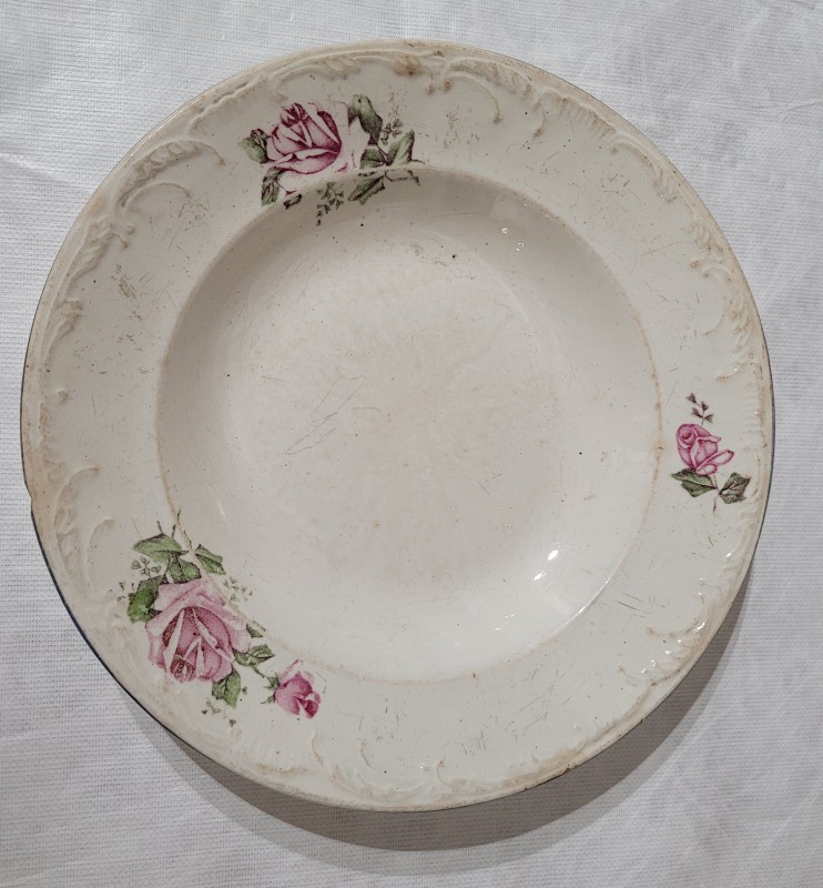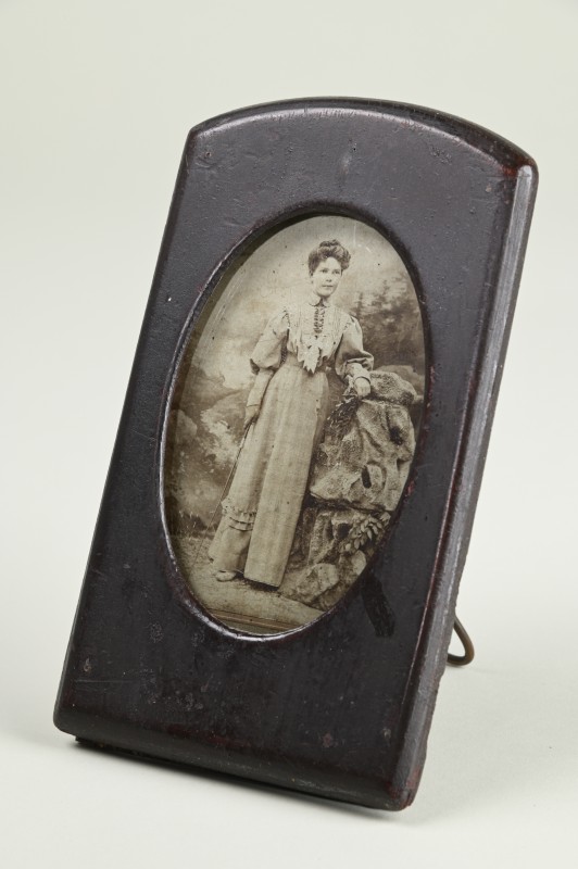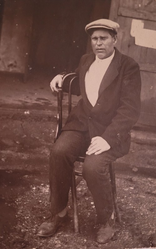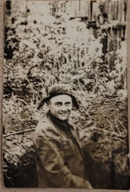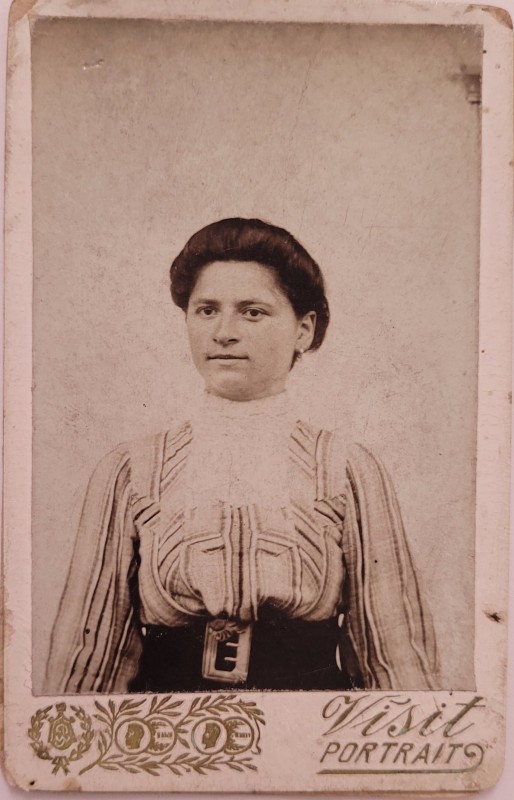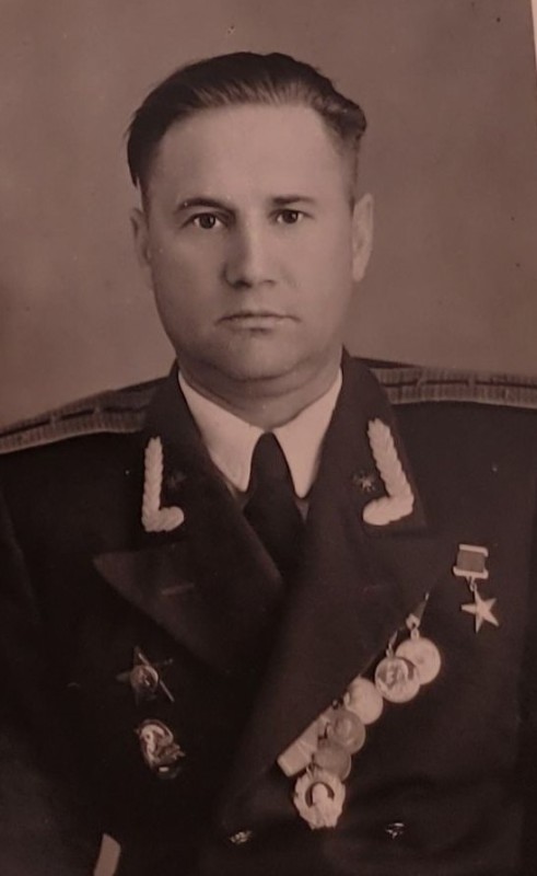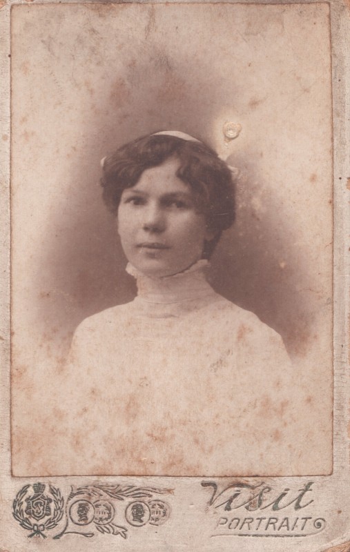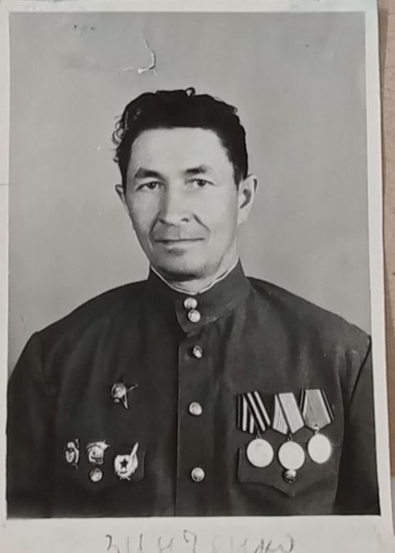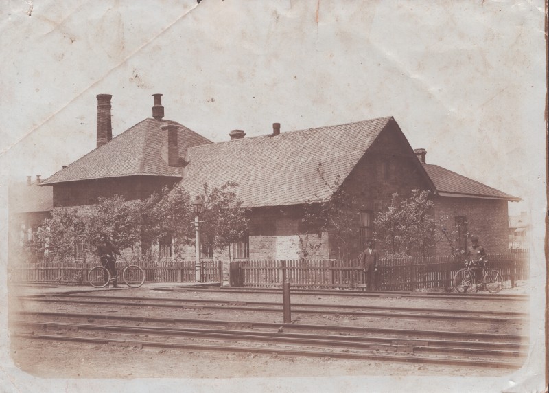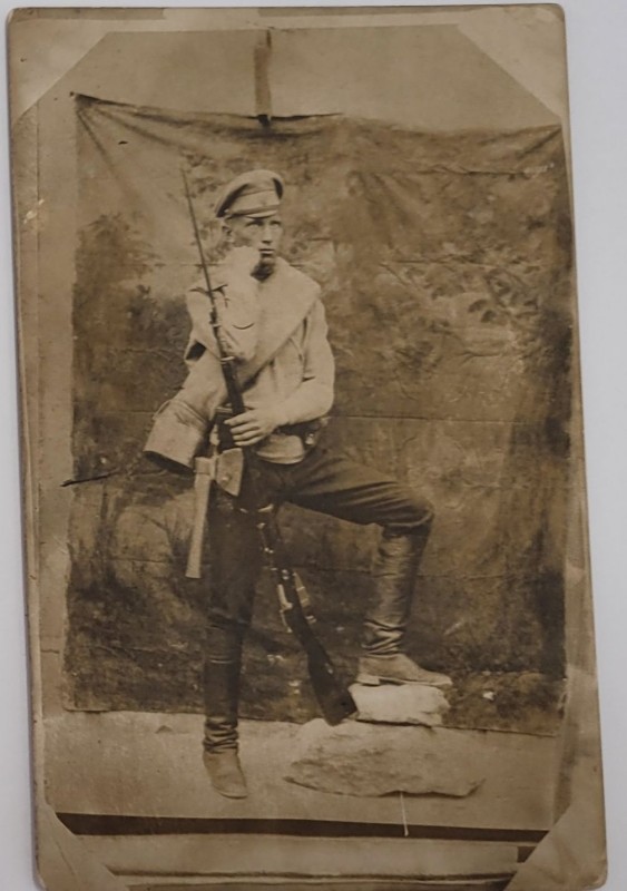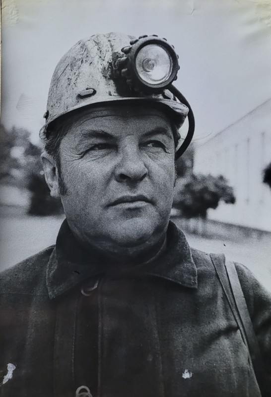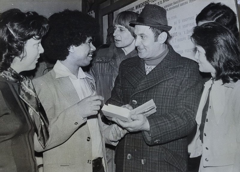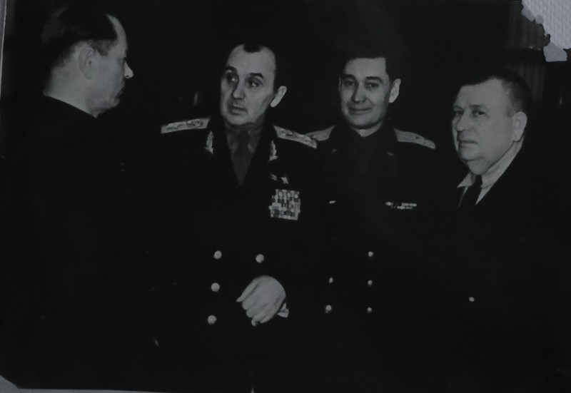 Зображення учнів та викладачів в декілька рядів. Перший ряд – хлопці напівлежачі. Праворуч чорна пляма. На з.п. фрагмент будівлі з двома вікнами. Посередині транспарант з написом білим кольором «1-е Травня».