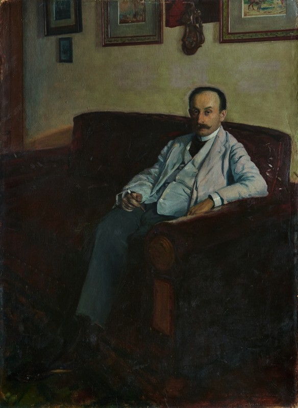 Жанрова композиція, виконана у кубістичній манері. На передньому плані зображено чоловіка в окулярах (голова легко нахилена вправо) з цигаркою у лівій руці, який сидить за столом, поклавши руки на поверхню. Справа на тарілці стоїть склянка поряд – пляшка. На другому плані силуетно зображено чоловіка в капелюху, який закрив рукою обличчя.