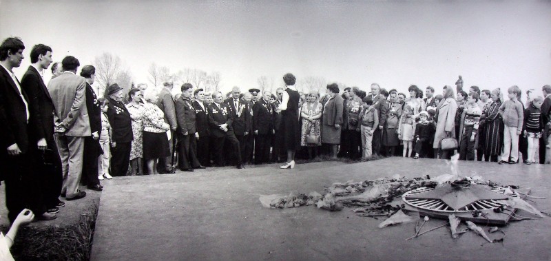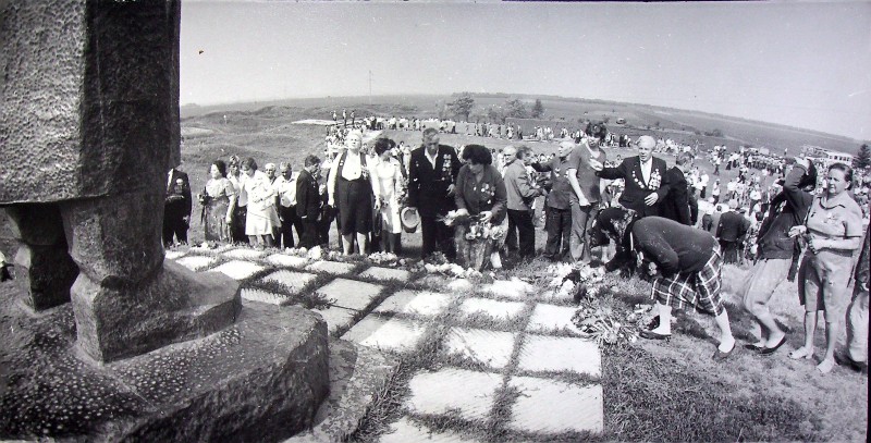 Фото. Ветерани 100-ї С.Д. (47 армії), охтирчани учасники Другої світової війни на кургані бойової слави проходять вздовж плит, на плитах лежать квіти , справа на пагорбі видно скульптуру скорботної матері. Серпень 1981рік
