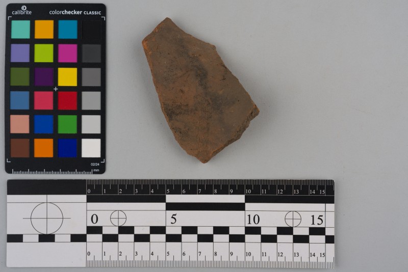 Вінчик посудини, фрагмент, коричневого кольору, прямий, зрізаний край, поверхня шороховата на дотик. Товщина 6 мм.