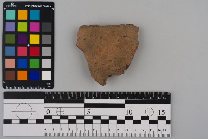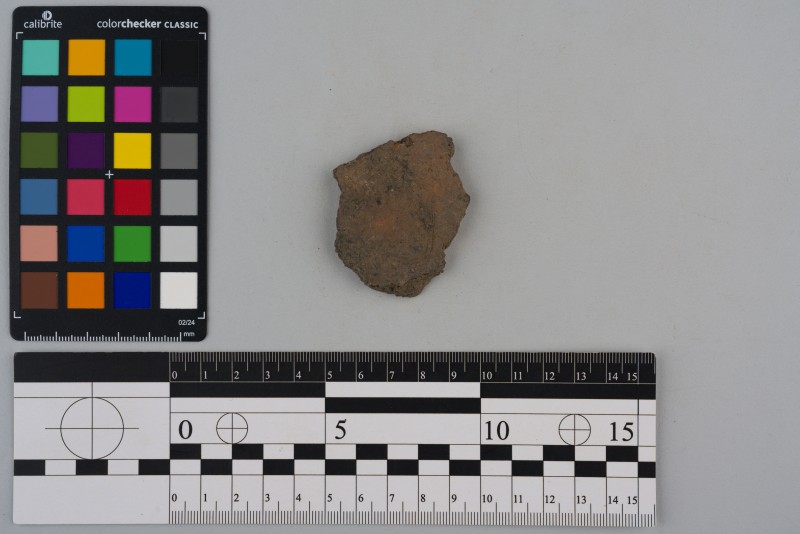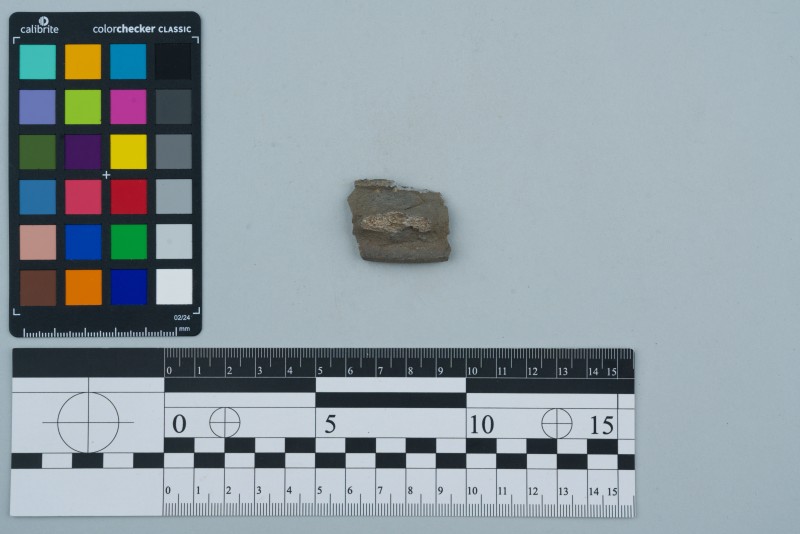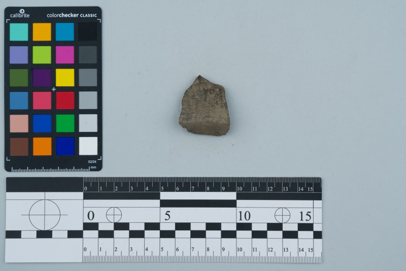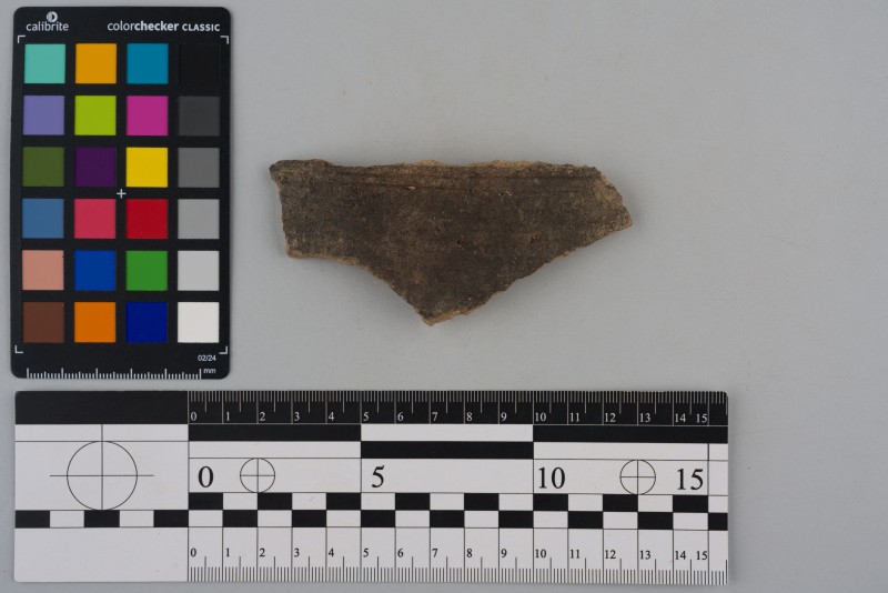 Вінчик посудини, фрагмент з боковиною, сірого кольору, сильно відігнутий, зрізаний край, боковина декорована горизонтальними витисненими лініями.