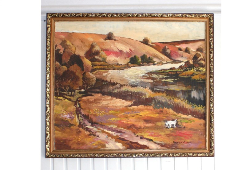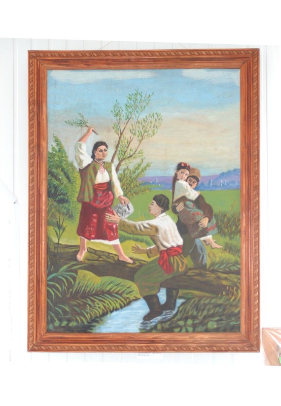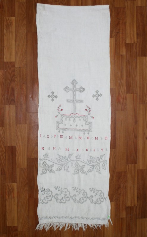 Вишивка на постіль прямокутної форми, білого кольору, бічні і верхній краї загнуті і прошиті. Нижні край зигзагоподібний з хвилястих ліній. Предмет оздоблений вишивкою у техніці «гладь» та «стебловий шов». Над кожним з 10 трикутників зиґзаґу композиція, в центрі якої квітка з листям, з її боків вусики, внизу рожевий бутон. Центральна квітка червоного, синього, жовтого та фіолетового кольорів. Ручне виготовлення.