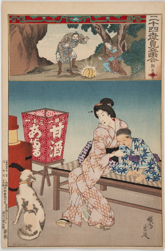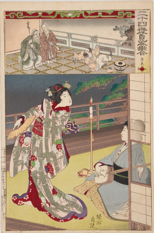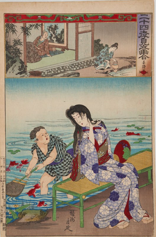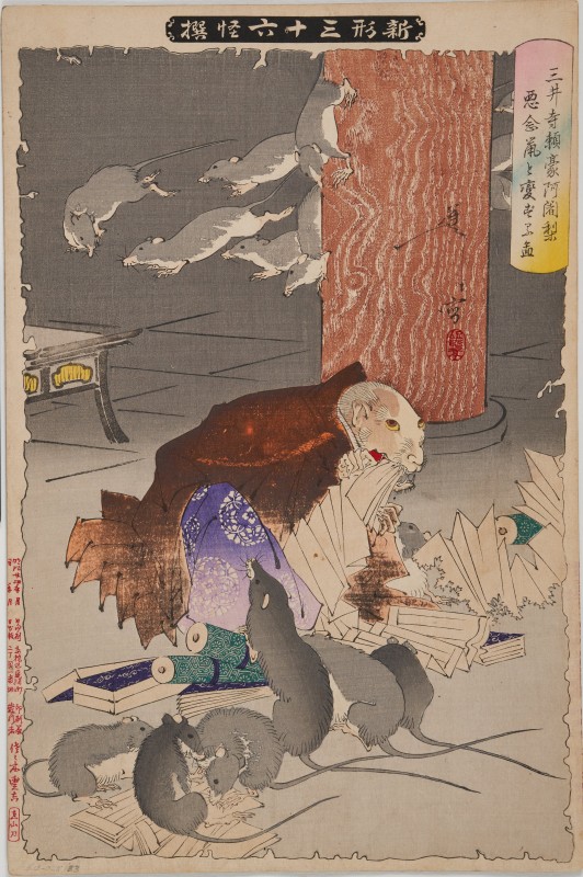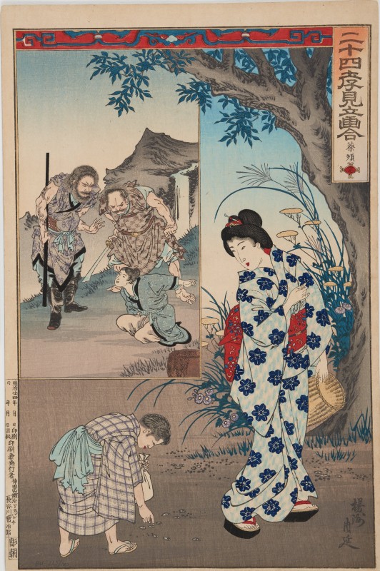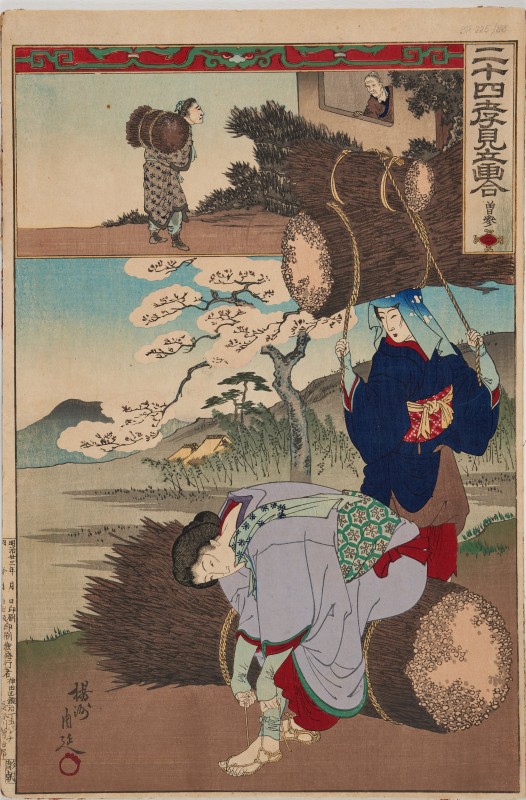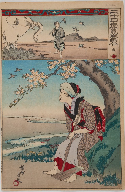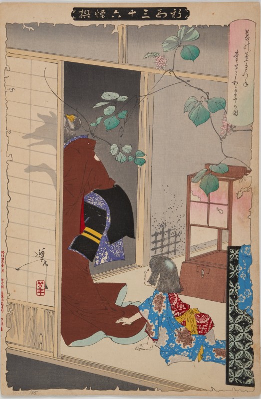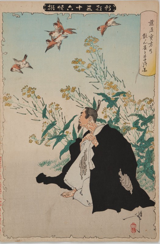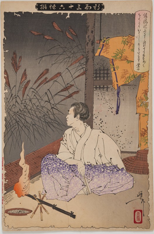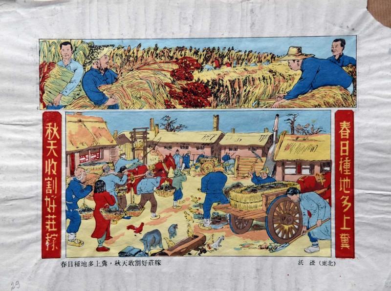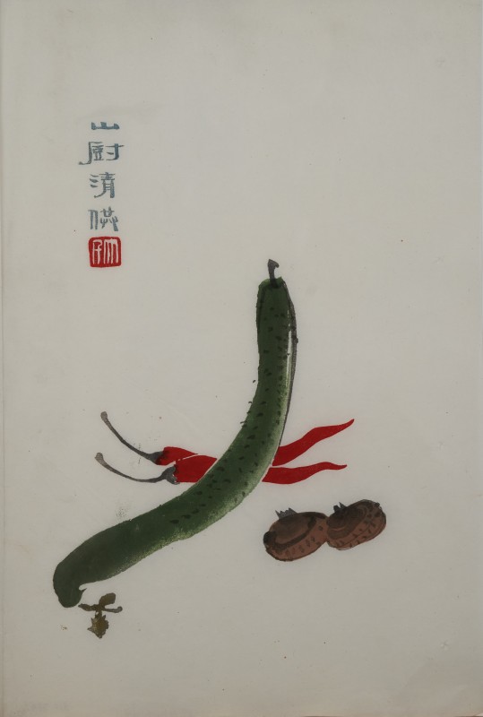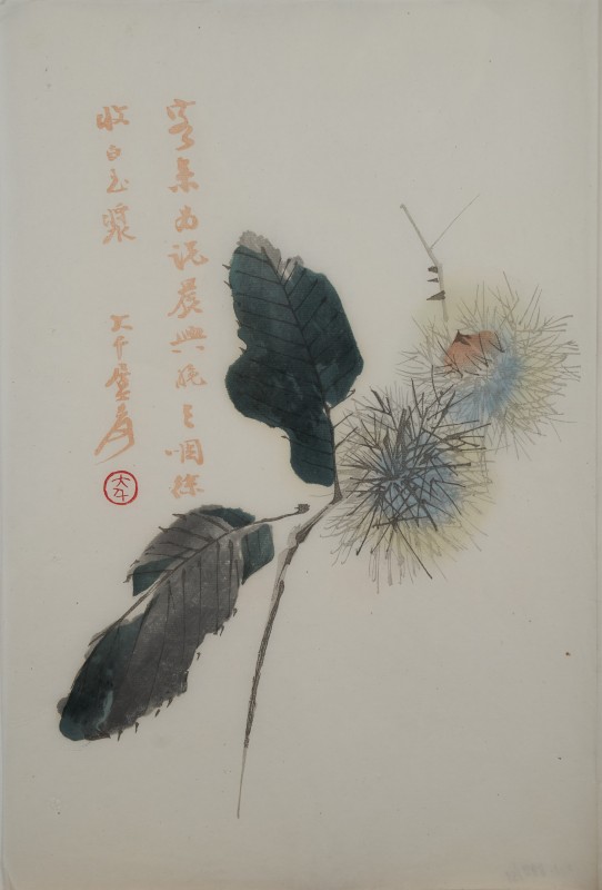 Праворуч, під жовтими колосками рису, що звисають у ліву сторону, зображено, знизу ліворуч за діогоналлю, зелену сарану. Внизу праворуч - вертикальний стовпчик ієрогліфів, написаних чорною тушшю і квадратна червона печатка - Затворник Му, що підтверджує авторство Ці Байші (1864-1957).