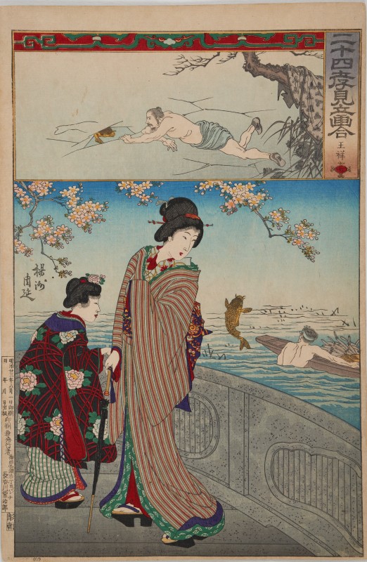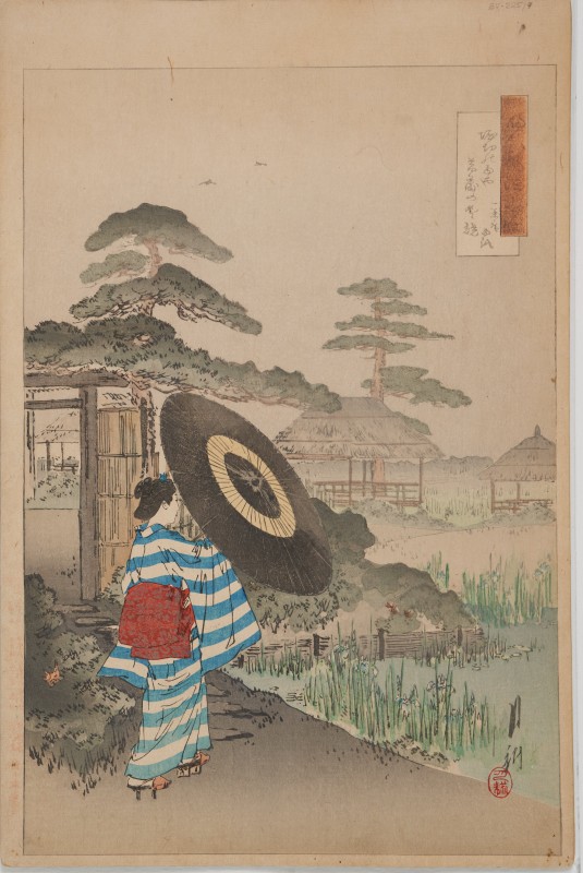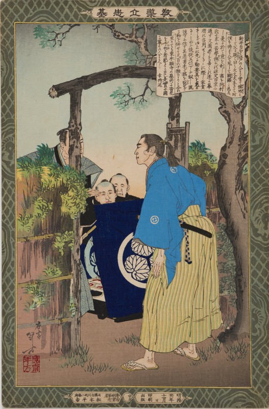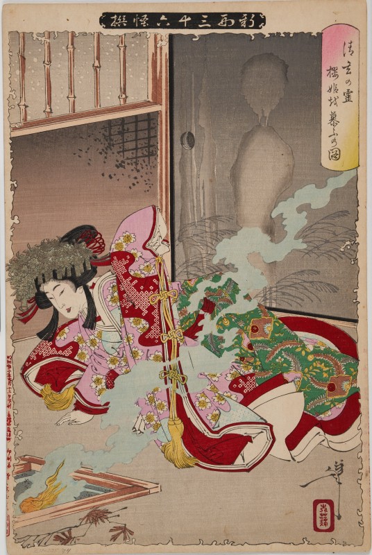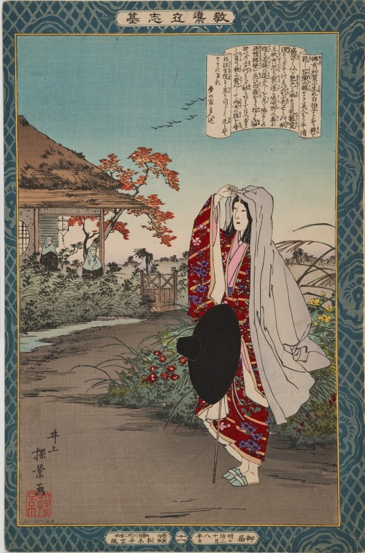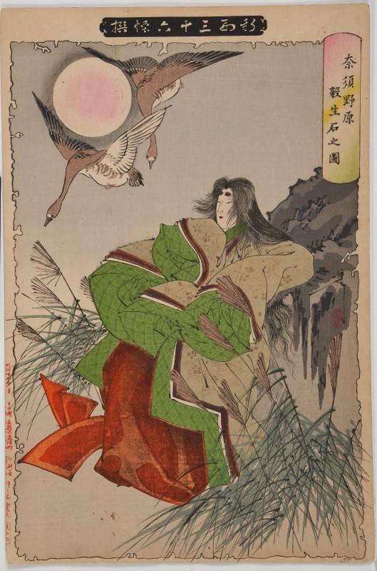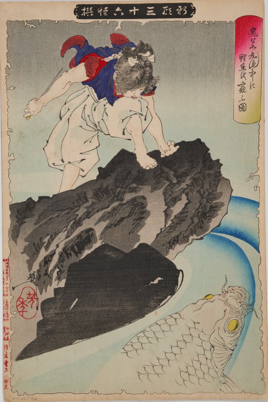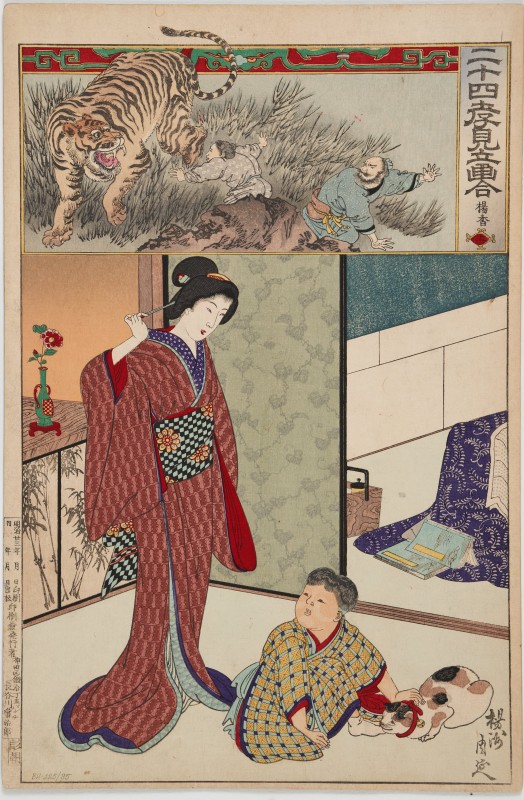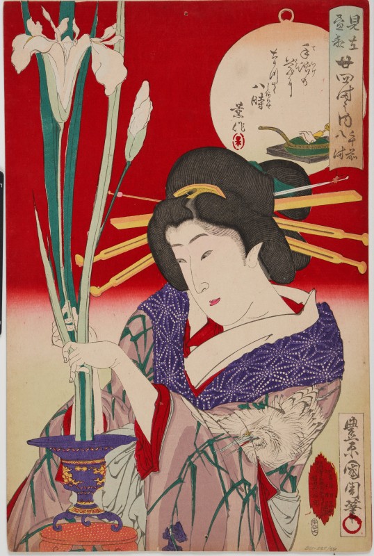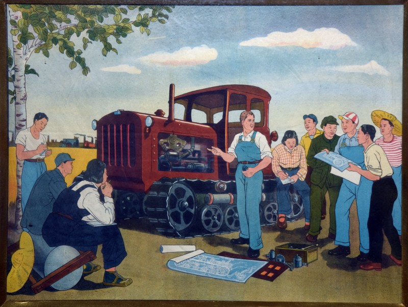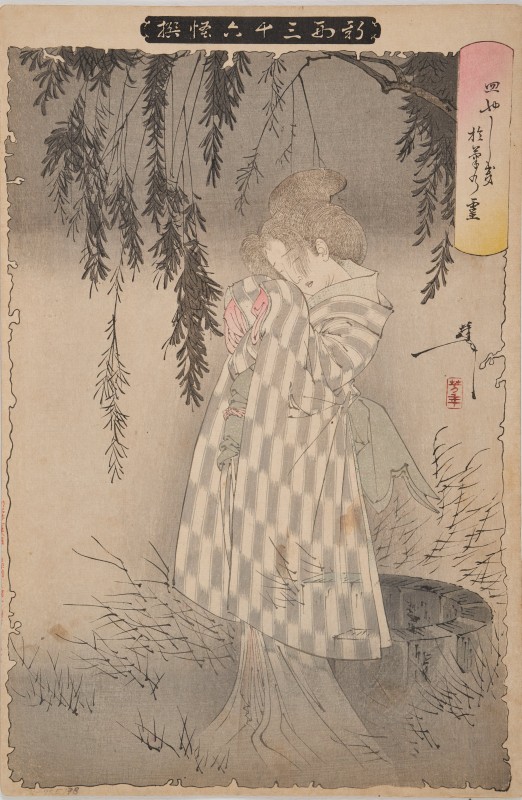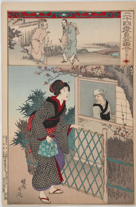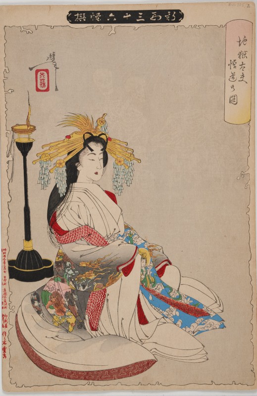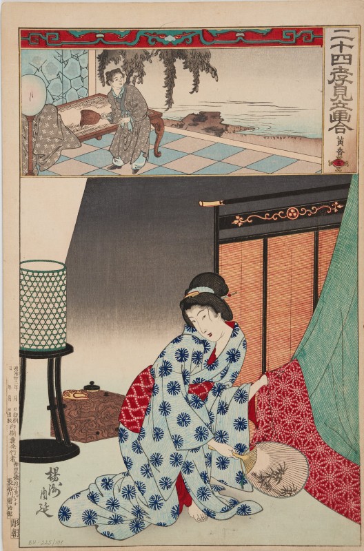 Праворуч, під жовтими колосками рису, що звисають у ліву сторону, зображено, знизу ліворуч за діогоналлю, зелену сарану. Внизу праворуч - вертикальний стовпчик ієрогліфів, написаних чорною тушшю і квадратна червона печатка - Затворник Му, що підтверджує авторство Ці Байші (1864-1957).
