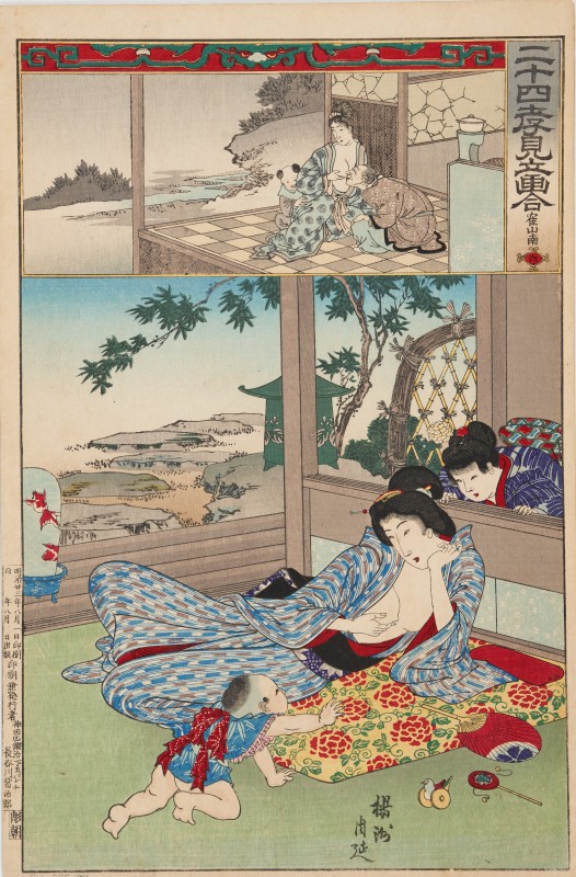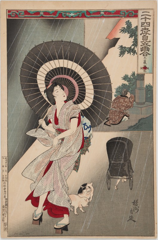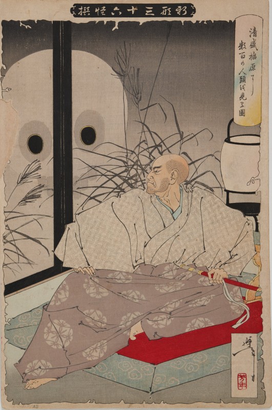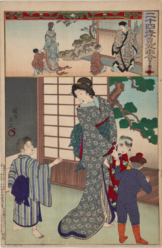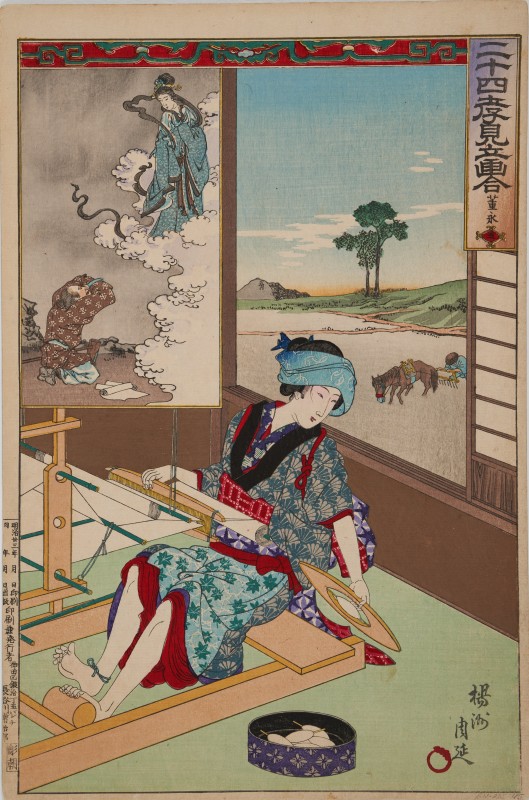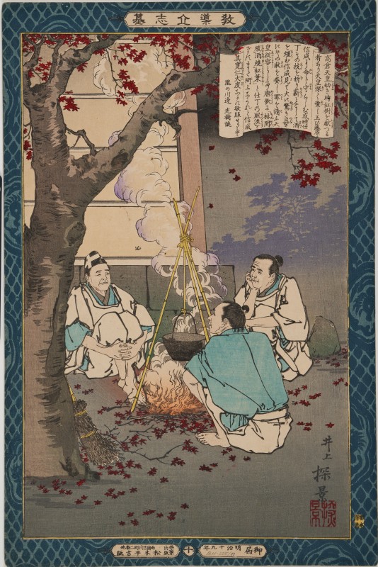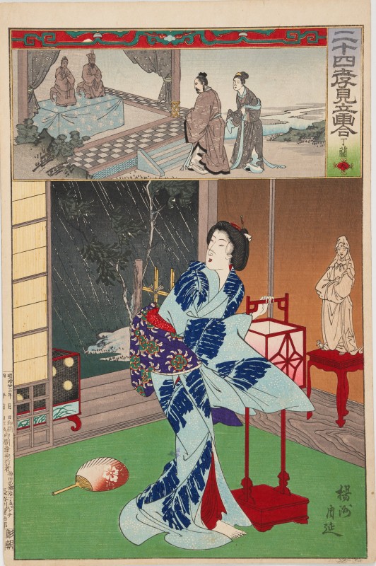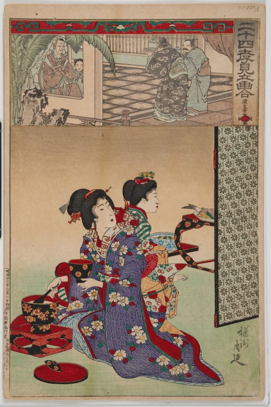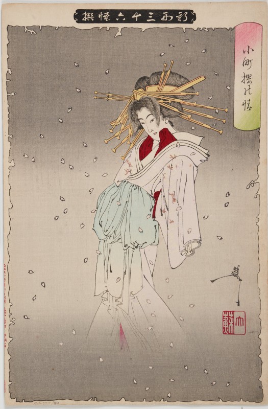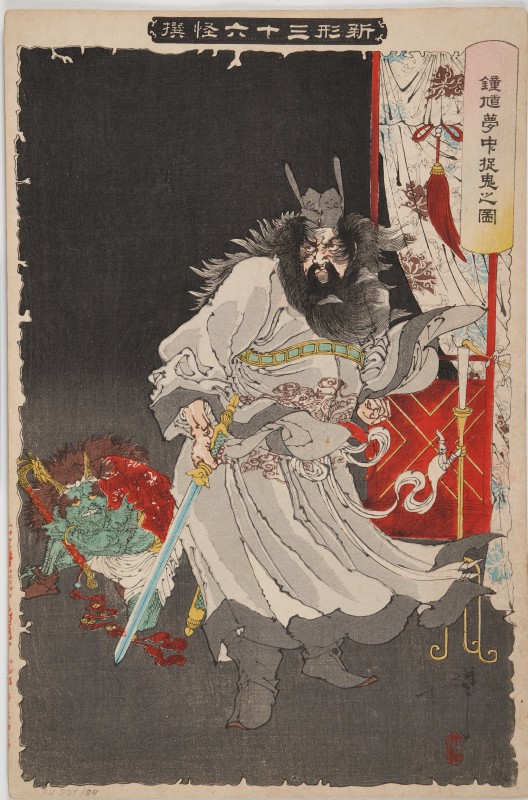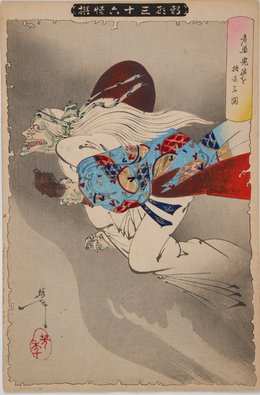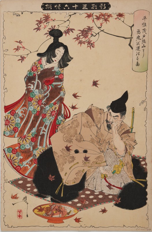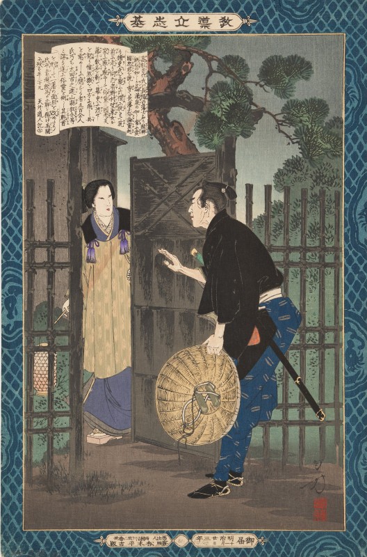 Праворуч, під жовтими колосками рису, що звисають у ліву сторону, зображено, знизу ліворуч за діогоналлю, зелену сарану. Внизу праворуч - вертикальний стовпчик ієрогліфів, написаних чорною тушшю і квадратна червона печатка - Затворник Му, що підтверджує авторство Ці Байші (1864-1957).