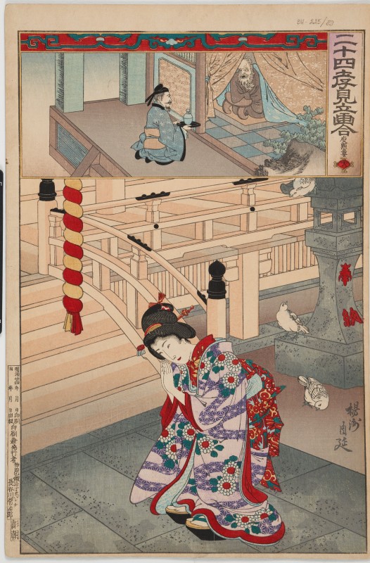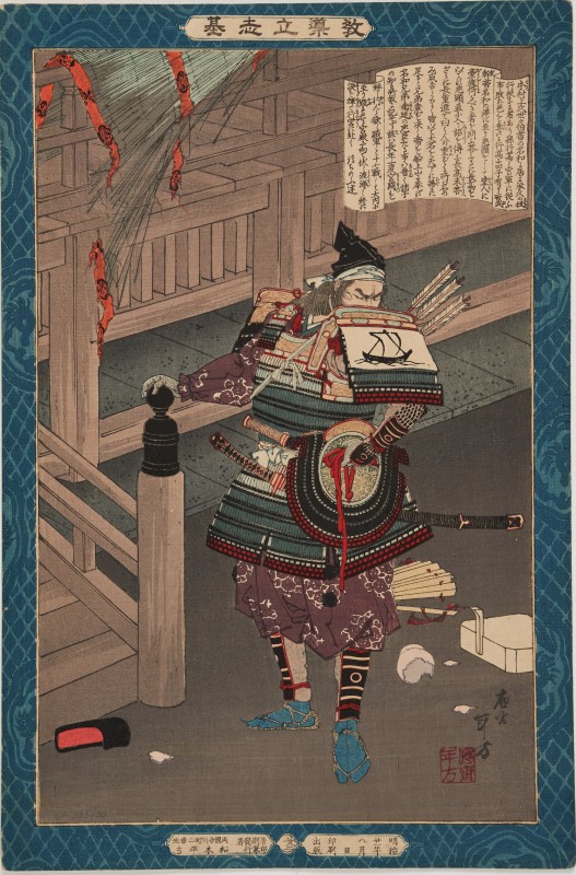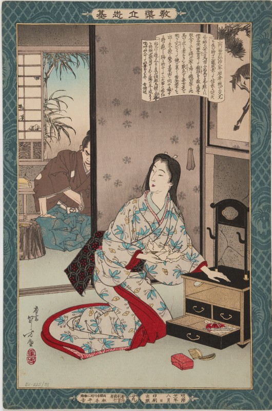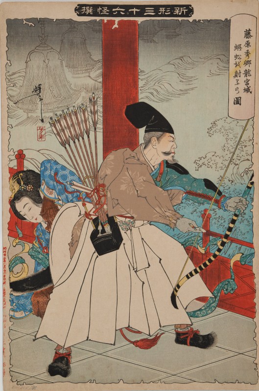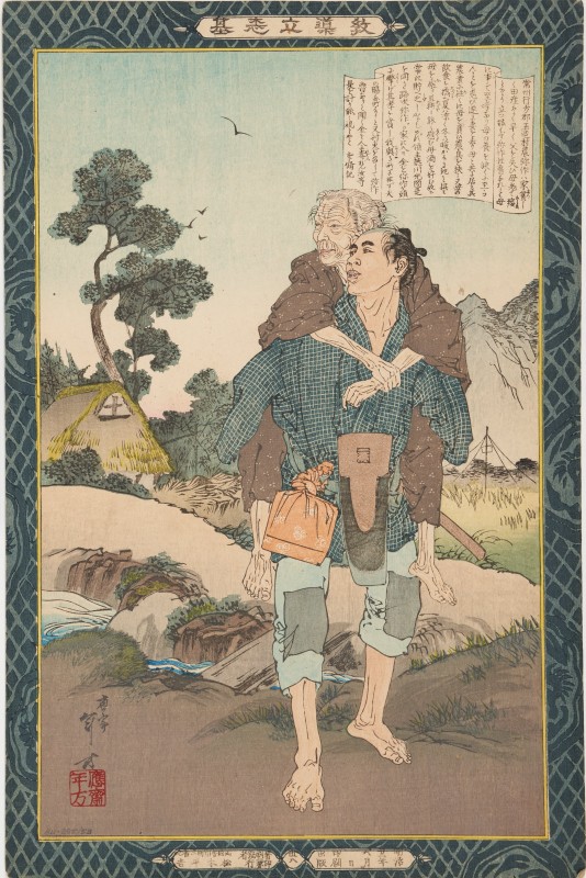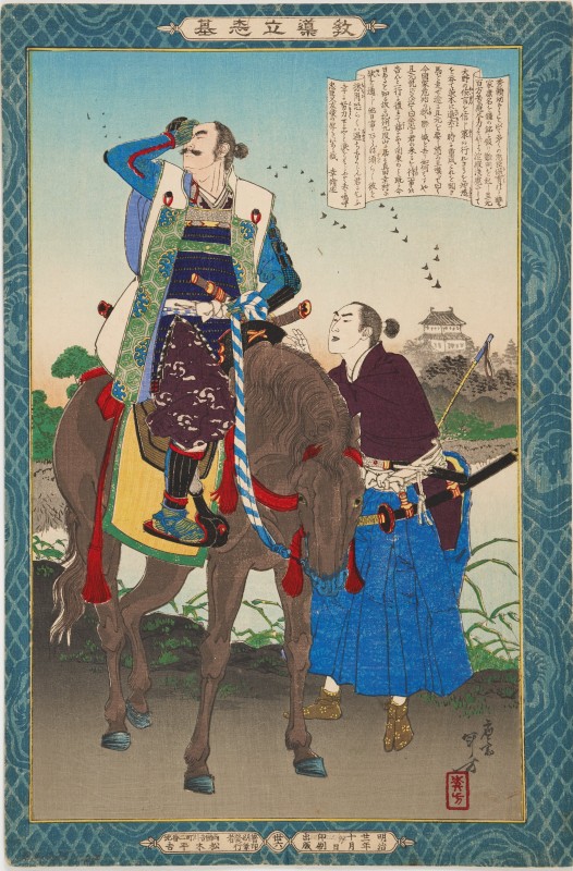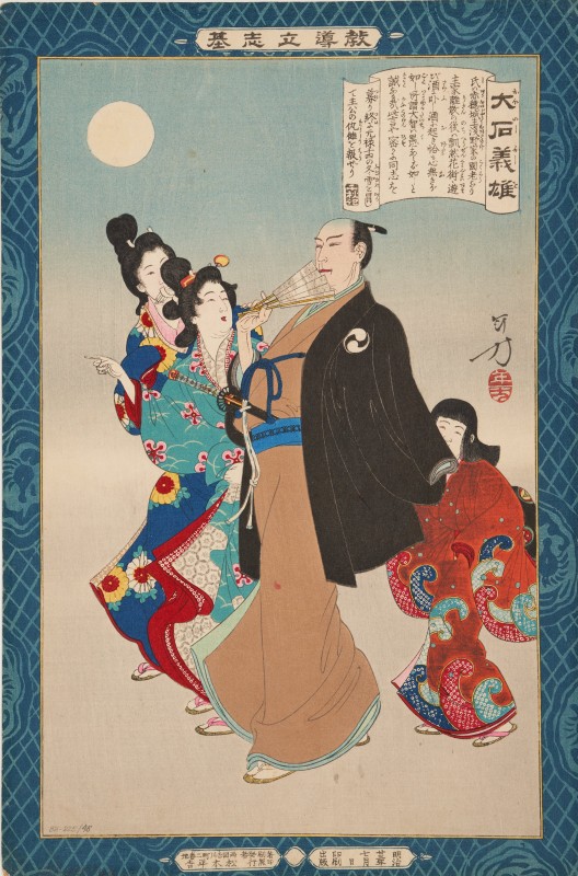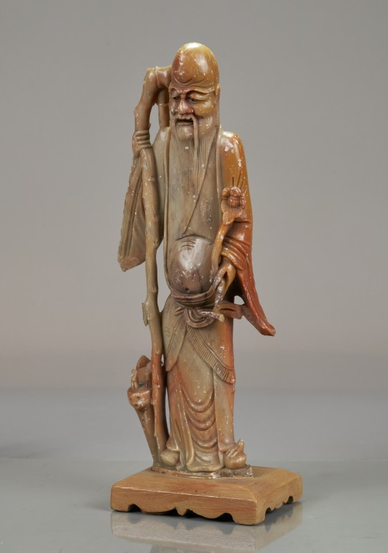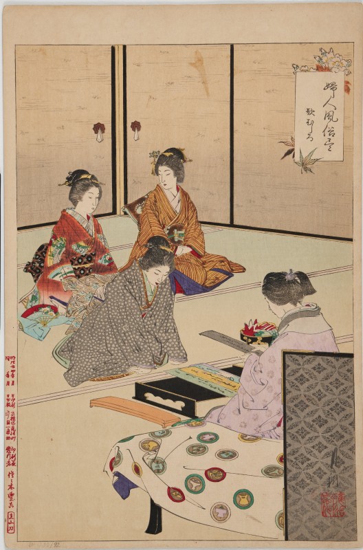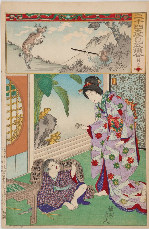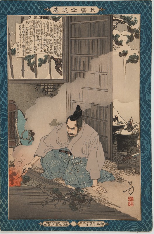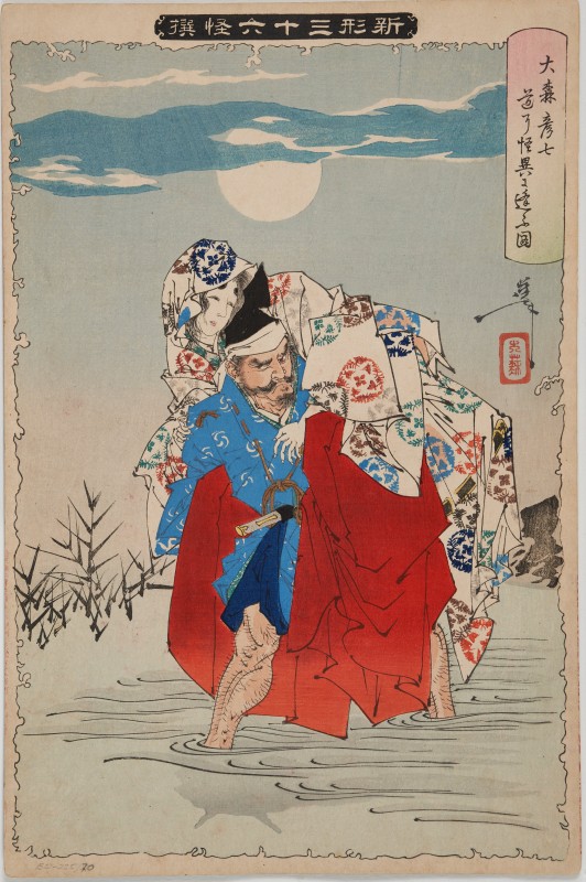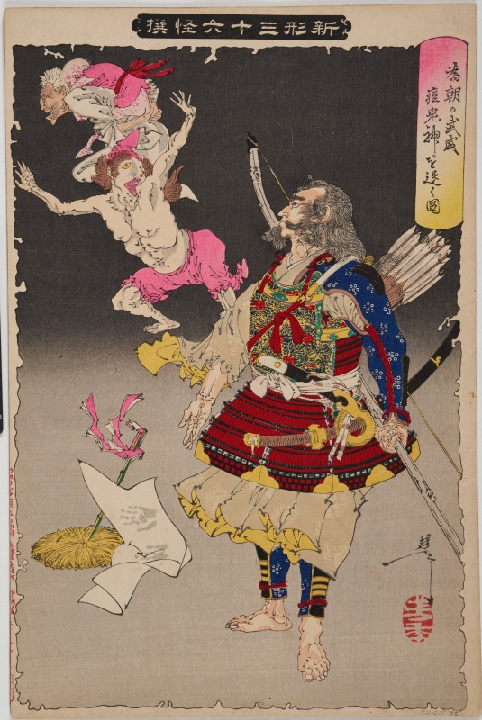 Праворуч, під жовтими колосками рису, що звисають у ліву сторону, зображено, знизу ліворуч за діогоналлю, зелену сарану. Внизу праворуч - вертикальний стовпчик ієрогліфів, написаних чорною тушшю і квадратна червона печатка - Затворник Му, що підтверджує авторство Ці Байші (1864-1957).