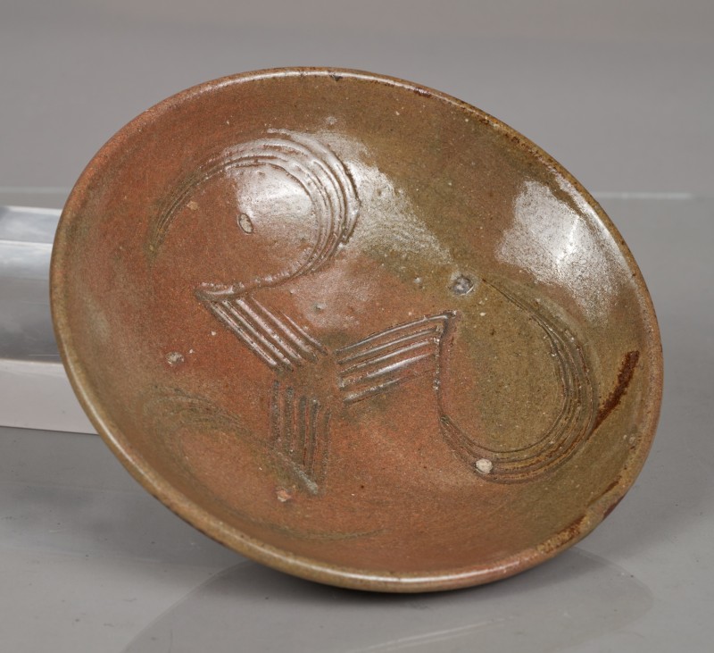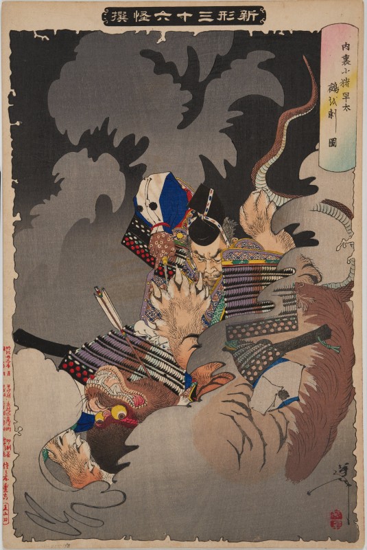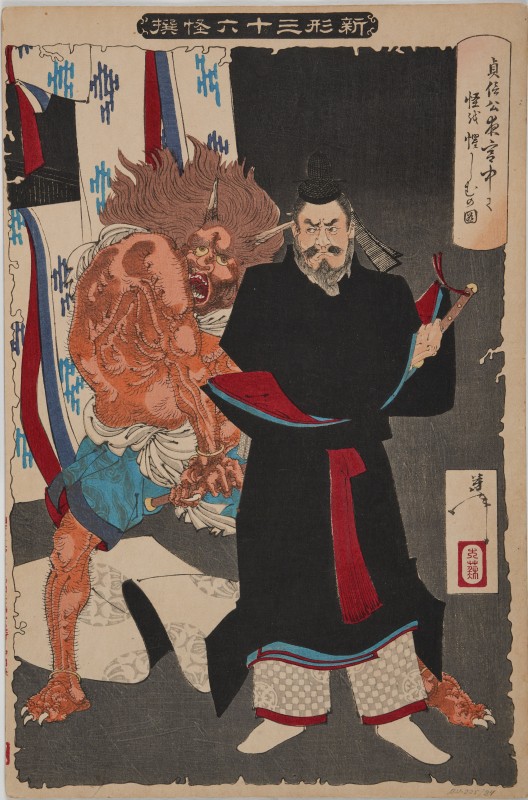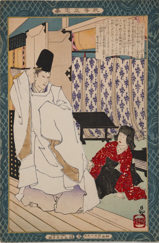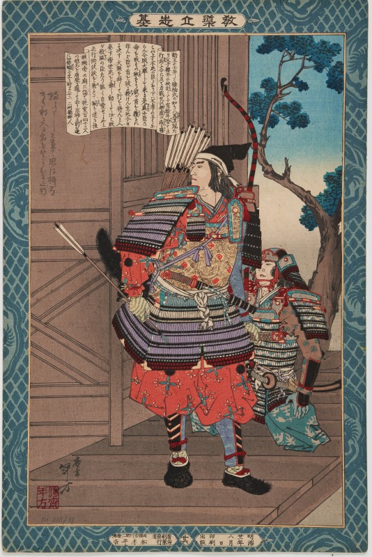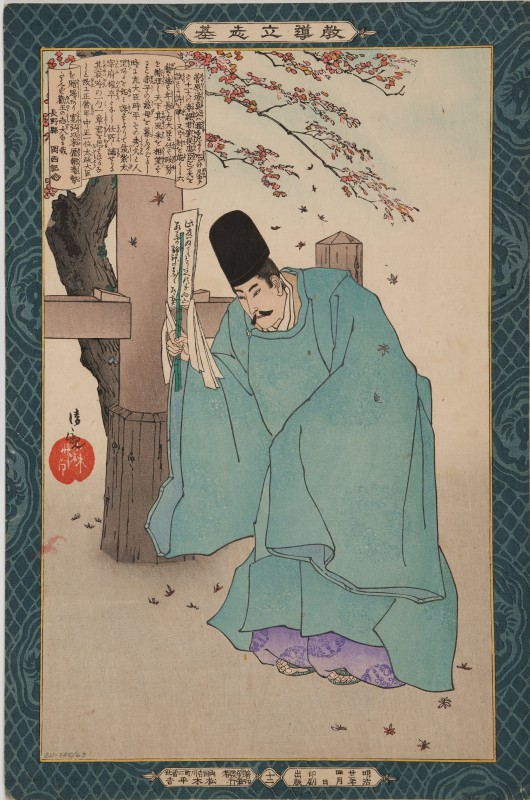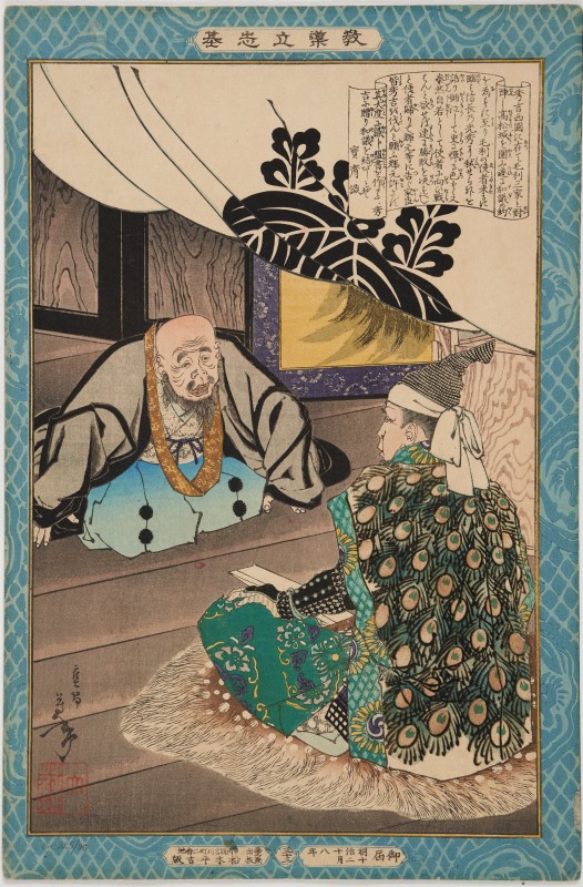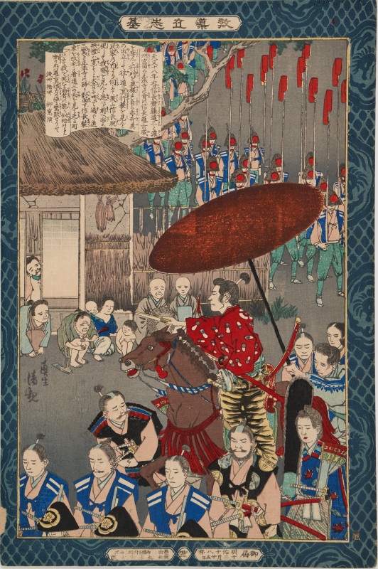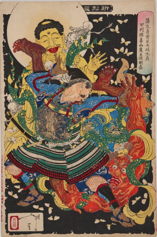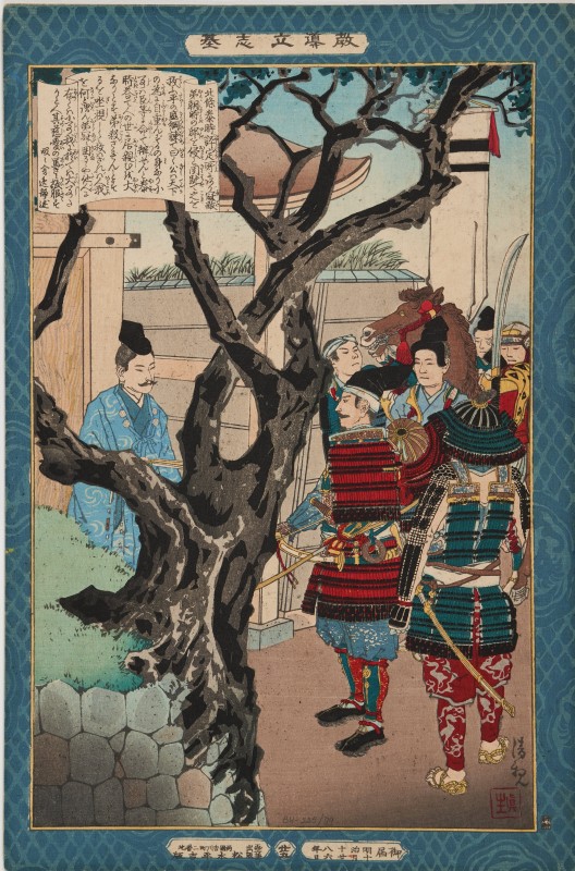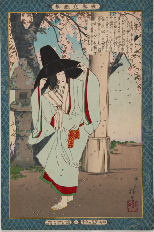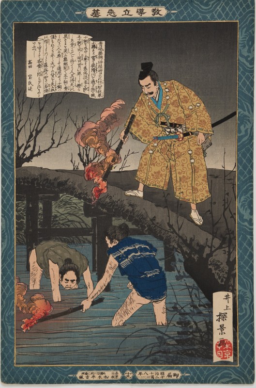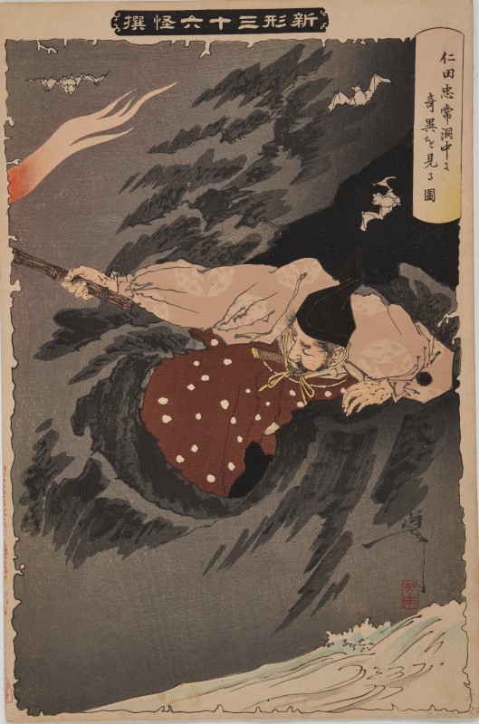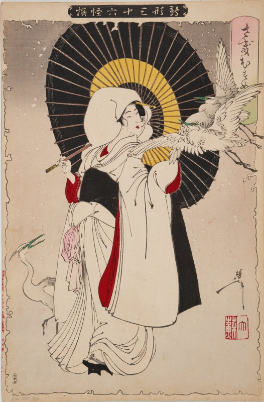 Праворуч, під жовтими колосками рису, що звисають у ліву сторону, зображено, знизу ліворуч за діогоналлю, зелену сарану. Внизу праворуч - вертикальний стовпчик ієрогліфів, написаних чорною тушшю і квадратна червона печатка - Затворник Му, що підтверджує авторство Ці Байші (1864-1957).