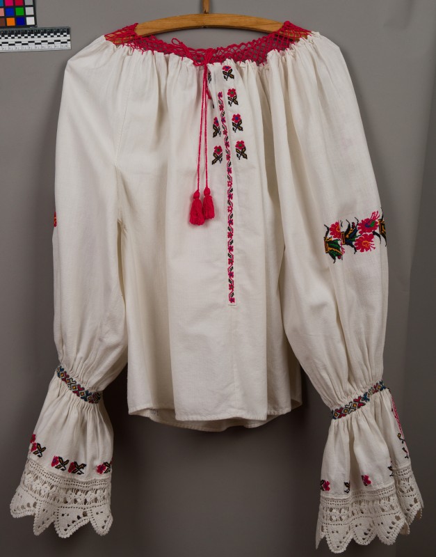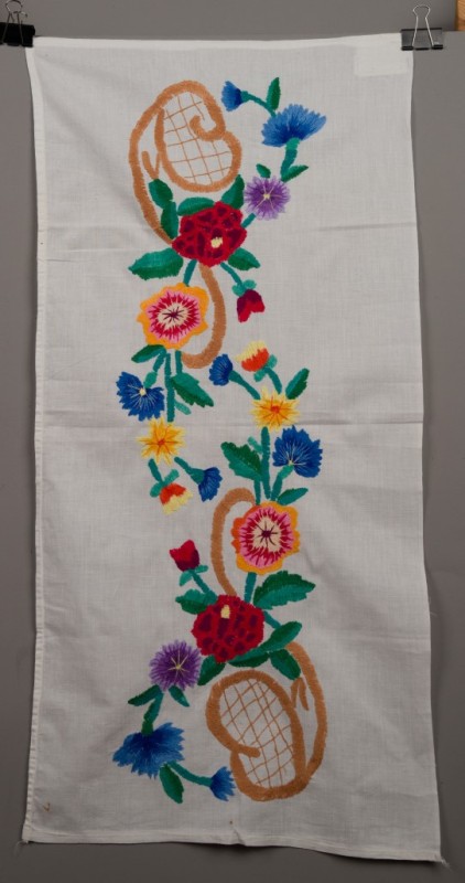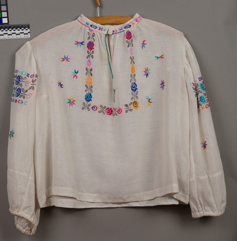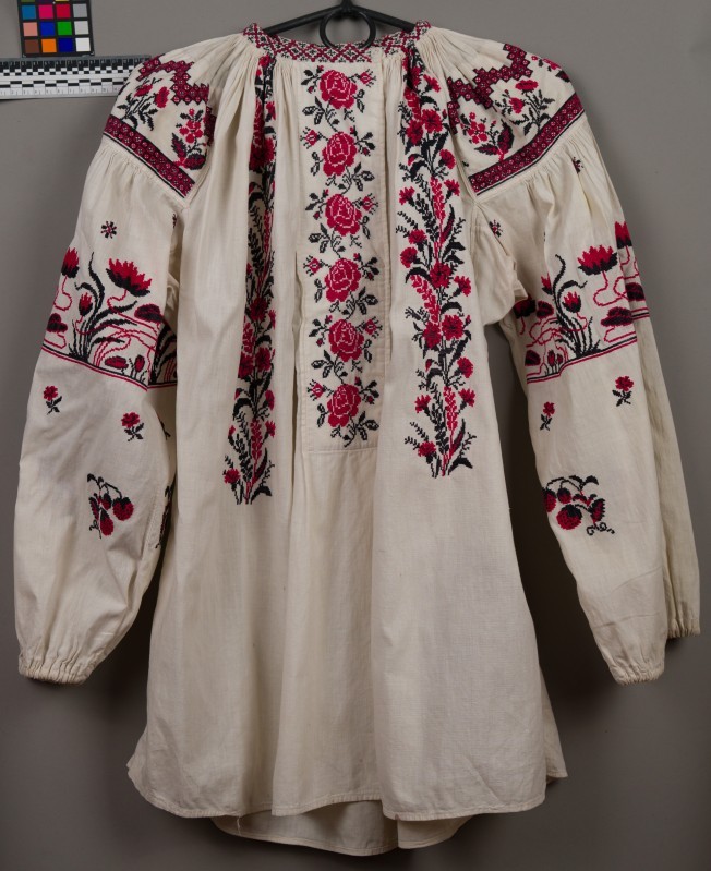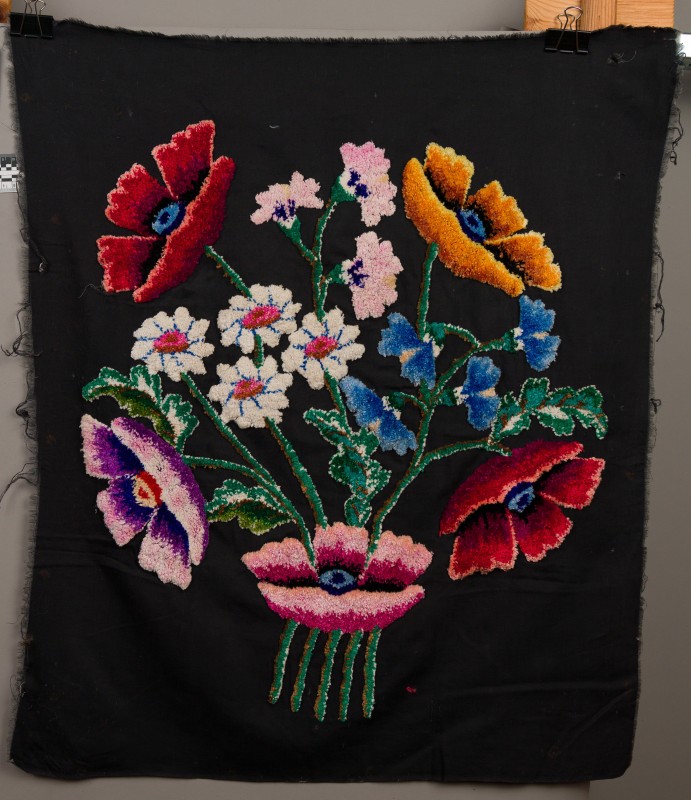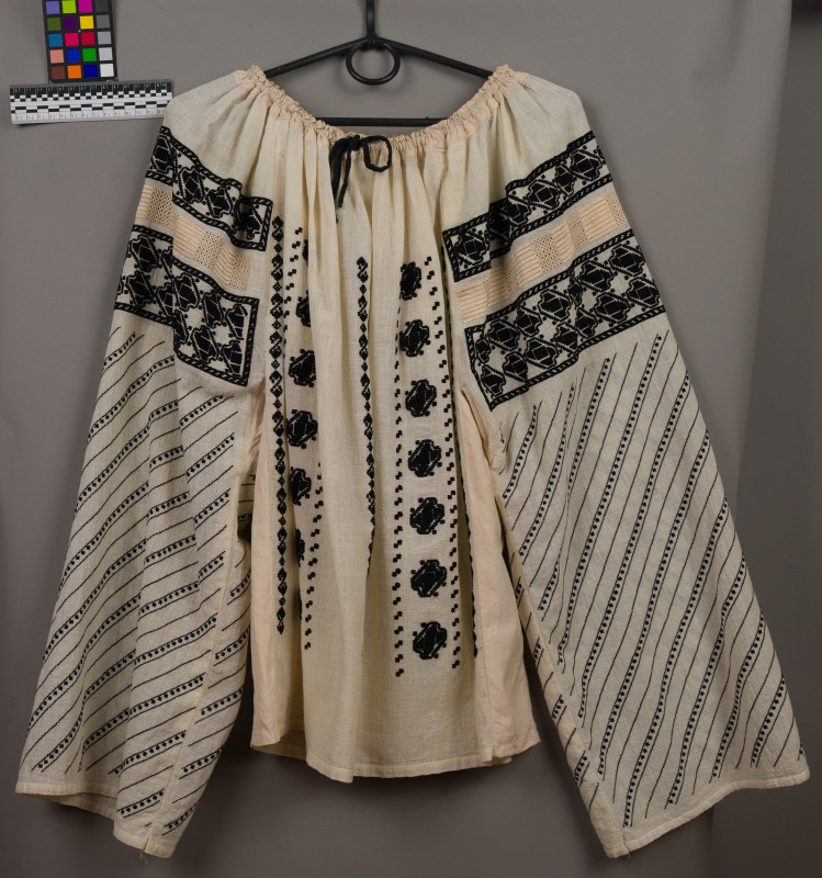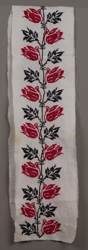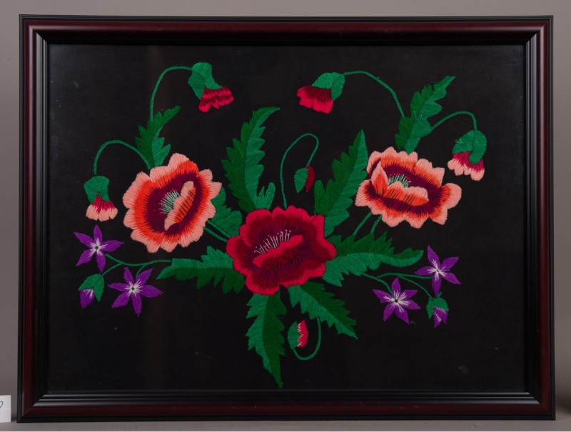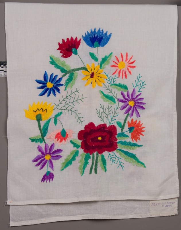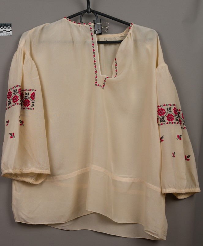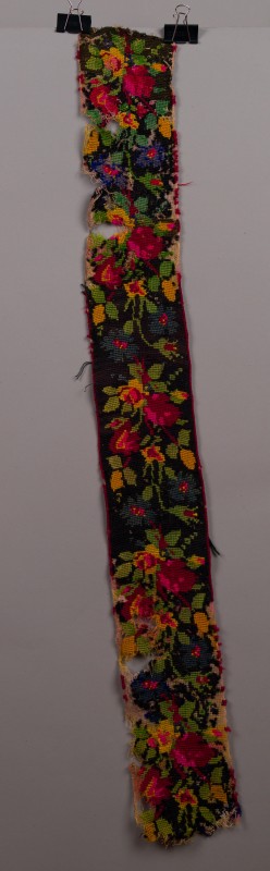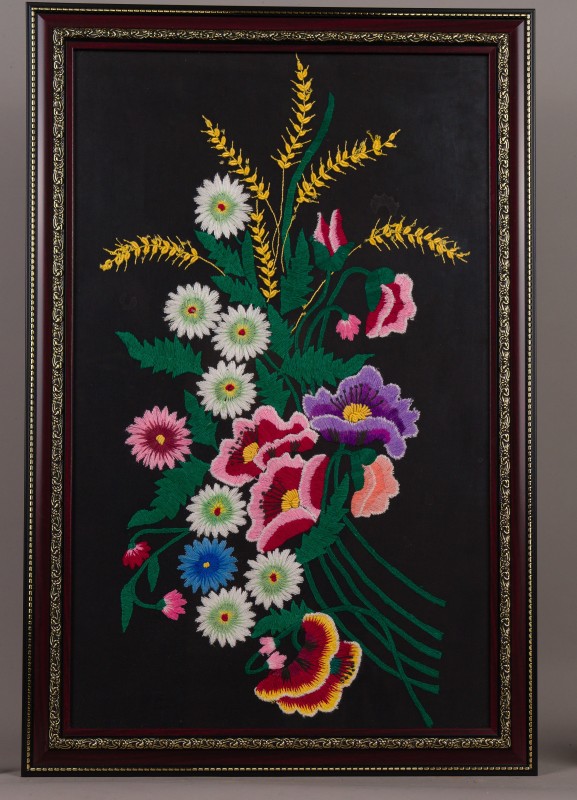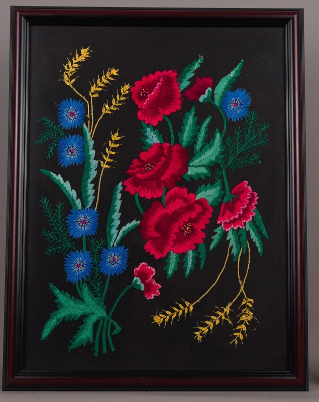 Жилет- коротка безрукавка з чорної вовняної тканини, вишита гладдю і стеблистим швом, зображує стибілізовані квіти нитками, муліне зеленого, червоного, жовтого, синього кольорів. Застібка на ліву сторону на сім металевих кнопок. Підкладка- бавовна сірого кольру. Початок ХХ століття.