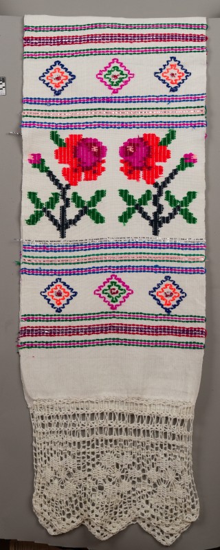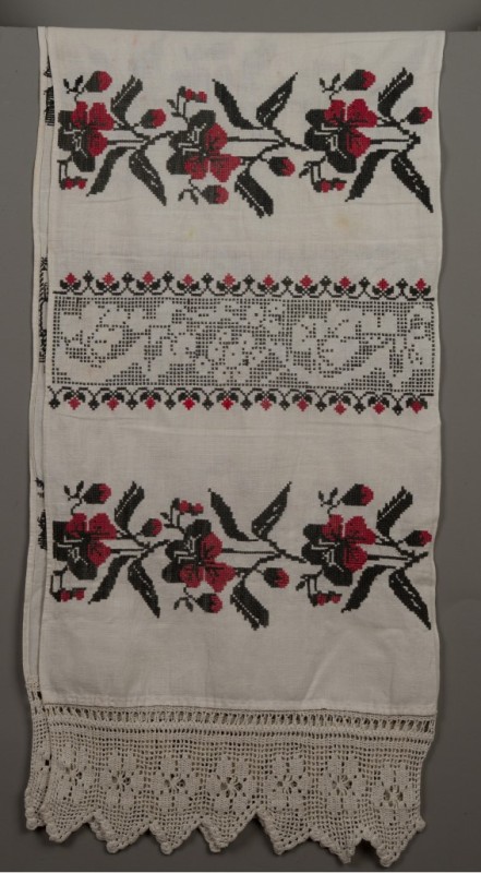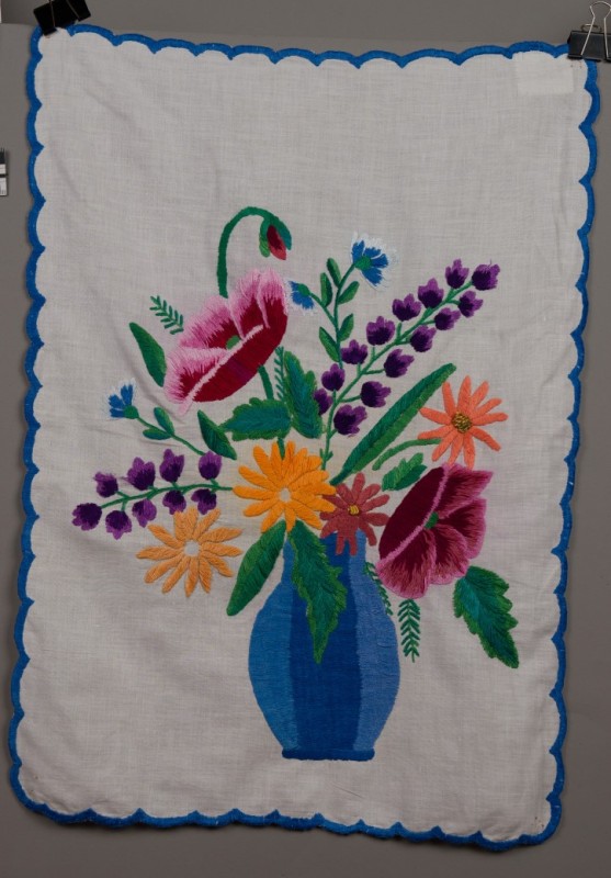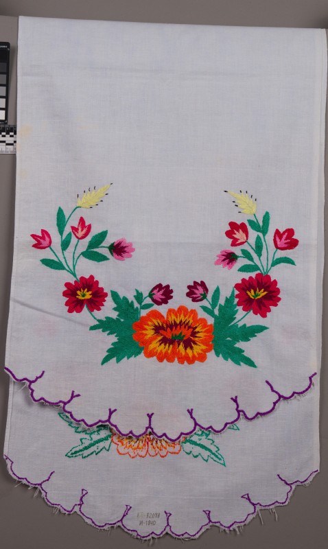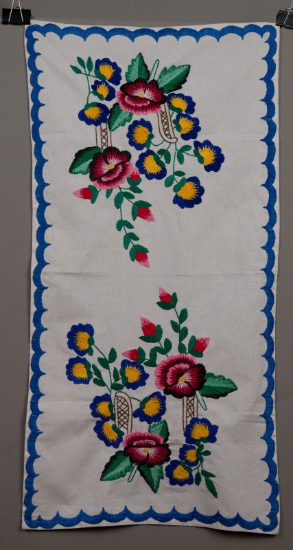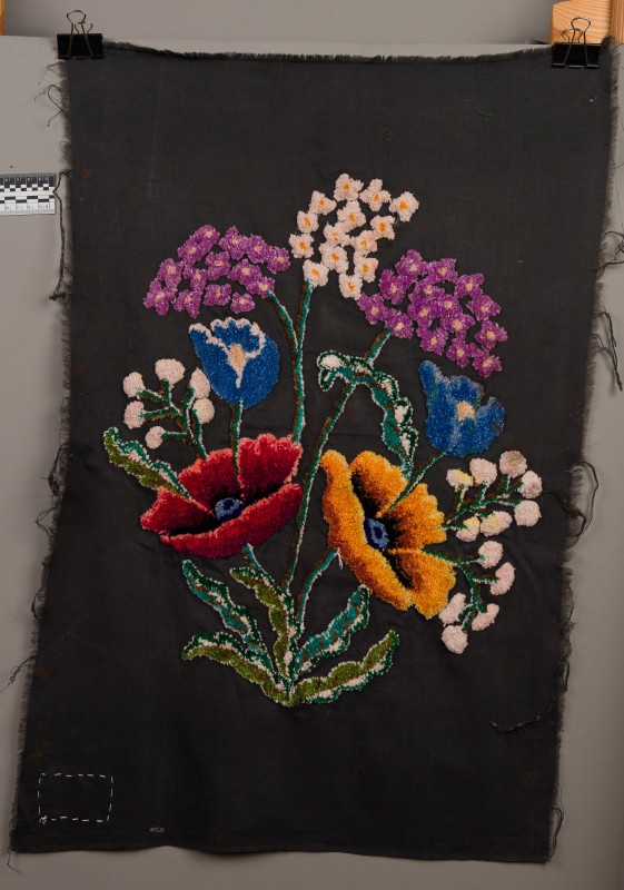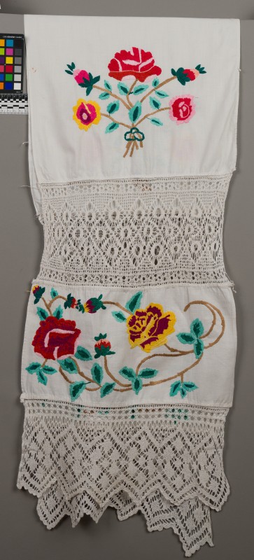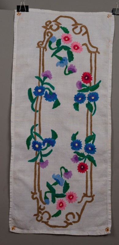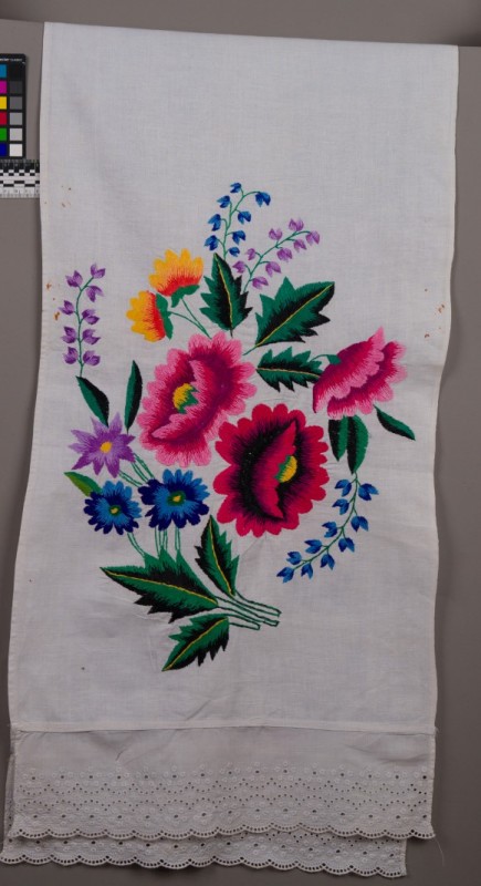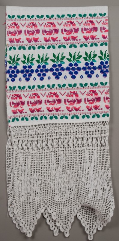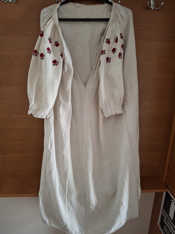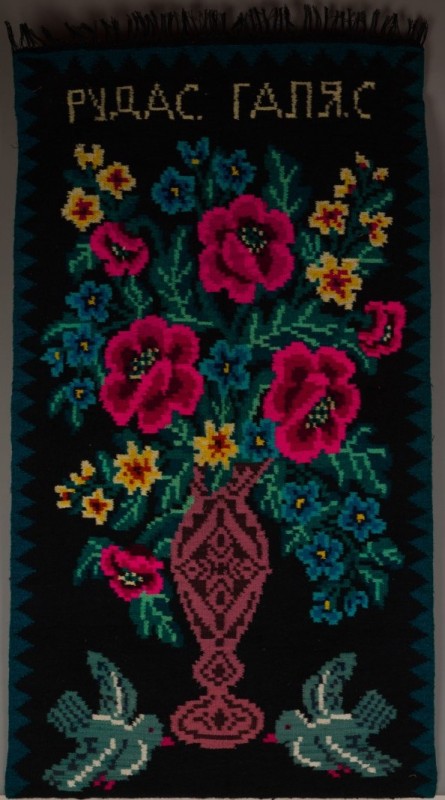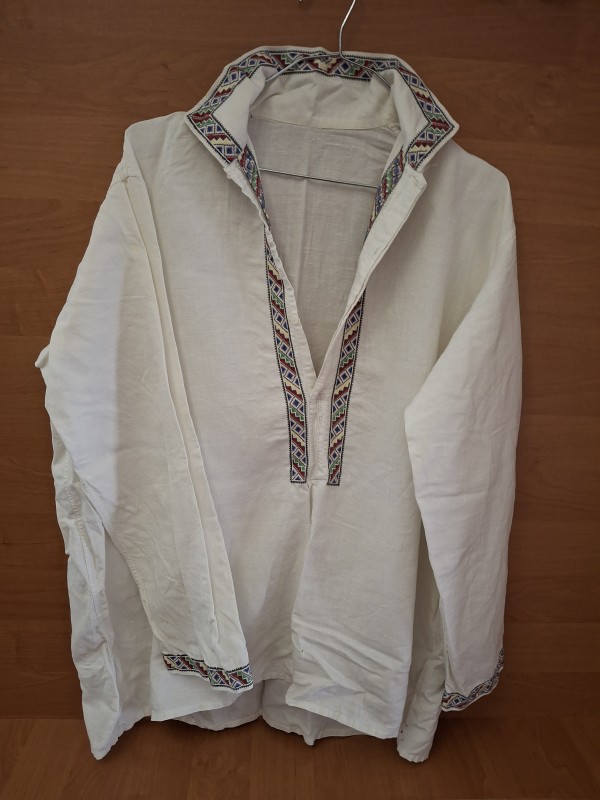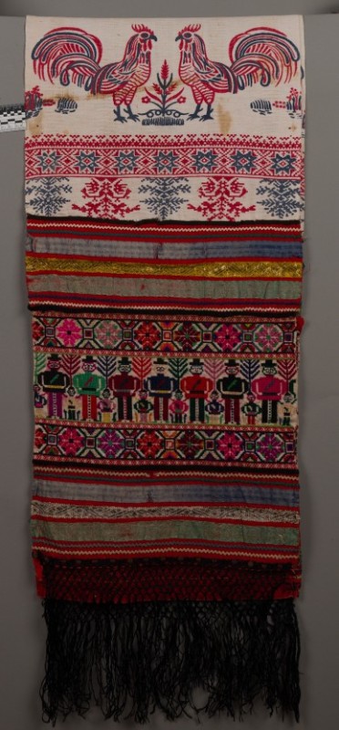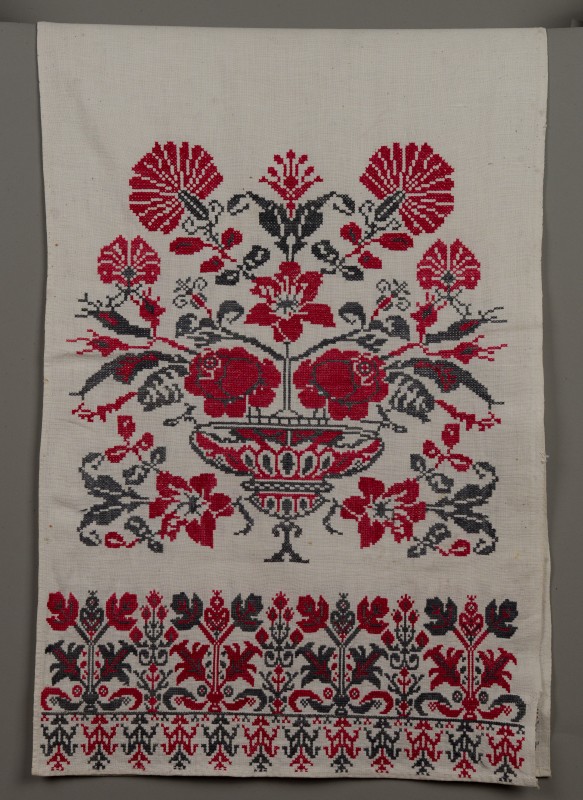 Жилет- коротка безрукавка з чорної вовняної тканини, вишита гладдю і стеблистим швом, зображує стибілізовані квіти нитками, муліне зеленого, червоного, жовтого, синього кольорів. Застібка на ліву сторону на сім металевих кнопок. Підкладка- бавовна сірого кольру. Початок ХХ століття.