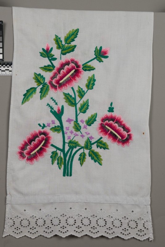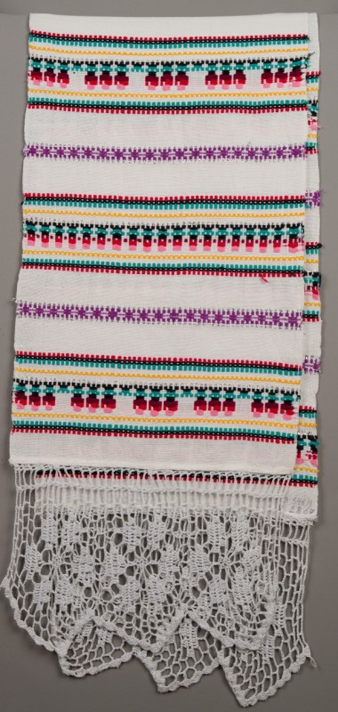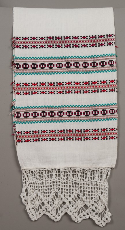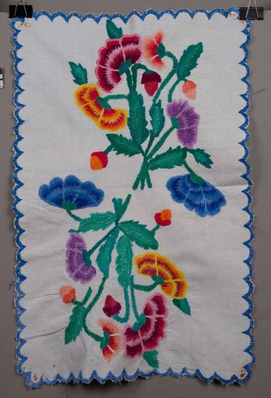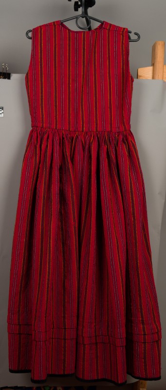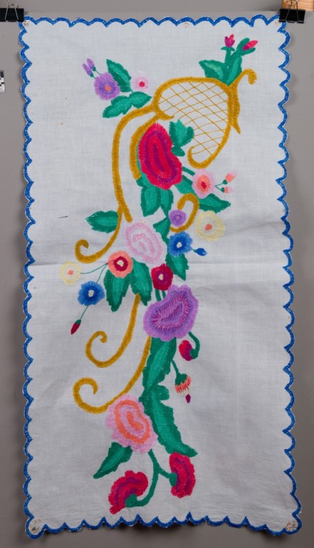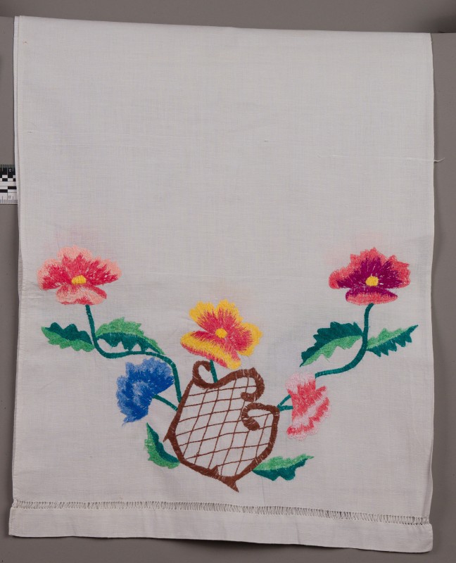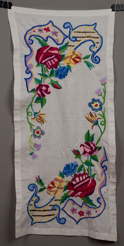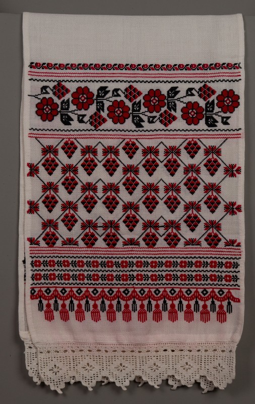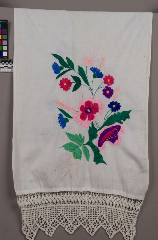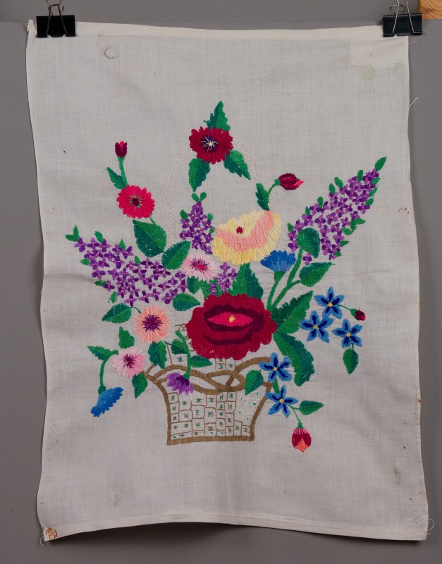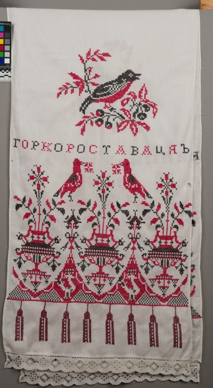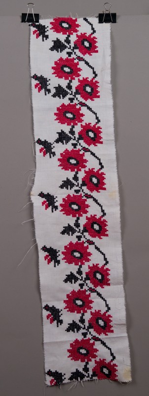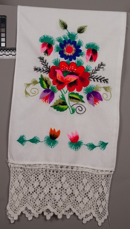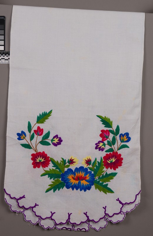 Жилет- коротка безрукавка з чорної вовняної тканини, вишита гладдю і стеблистим швом, зображує стибілізовані квіти нитками, муліне зеленого, червоного, жовтого, синього кольорів. Застібка на ліву сторону на сім металевих кнопок. Підкладка- бавовна сірого кольру. Початок ХХ століття.