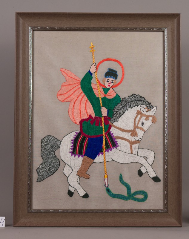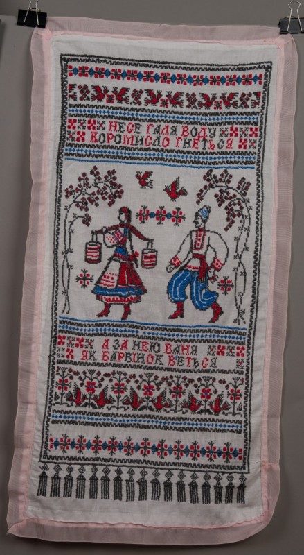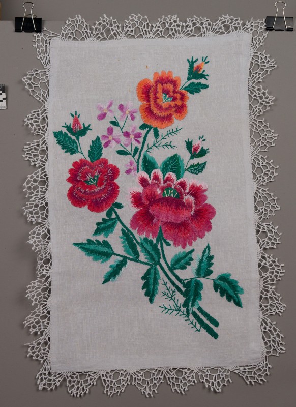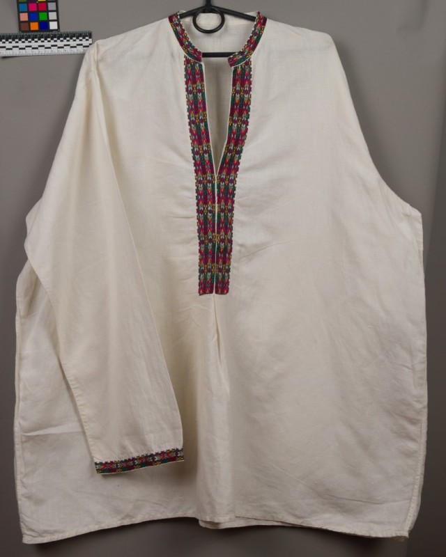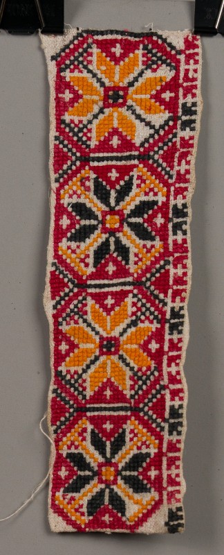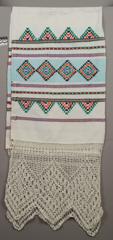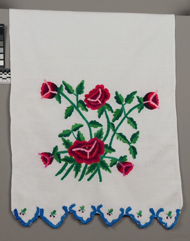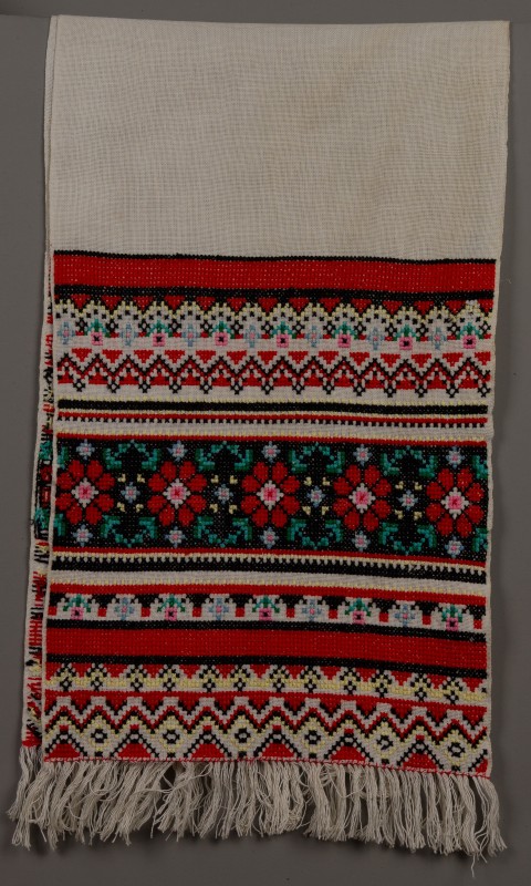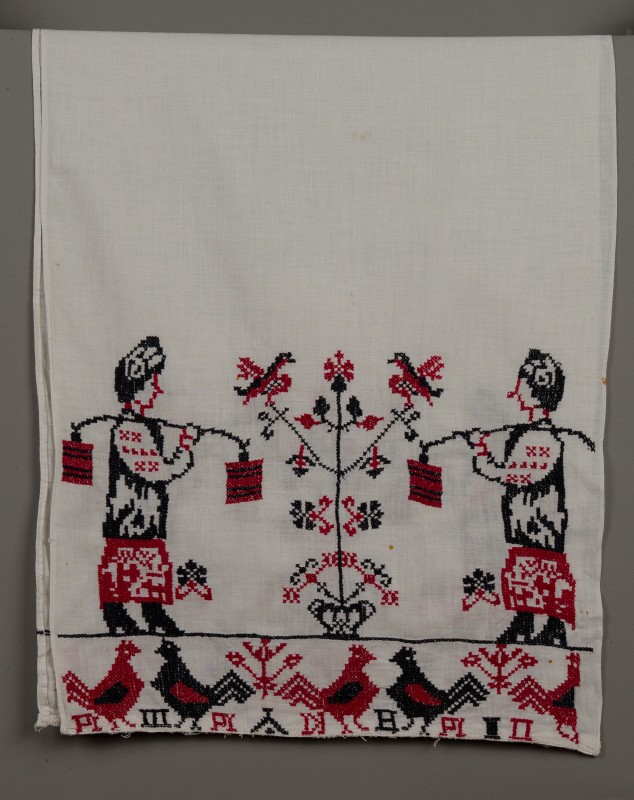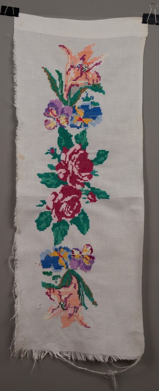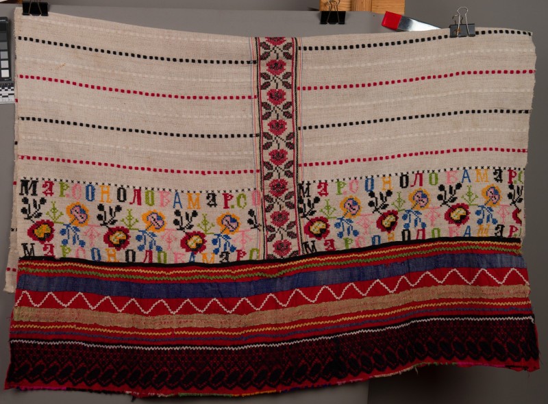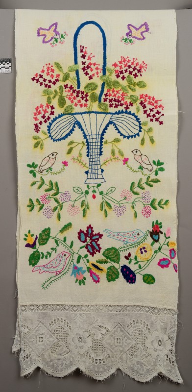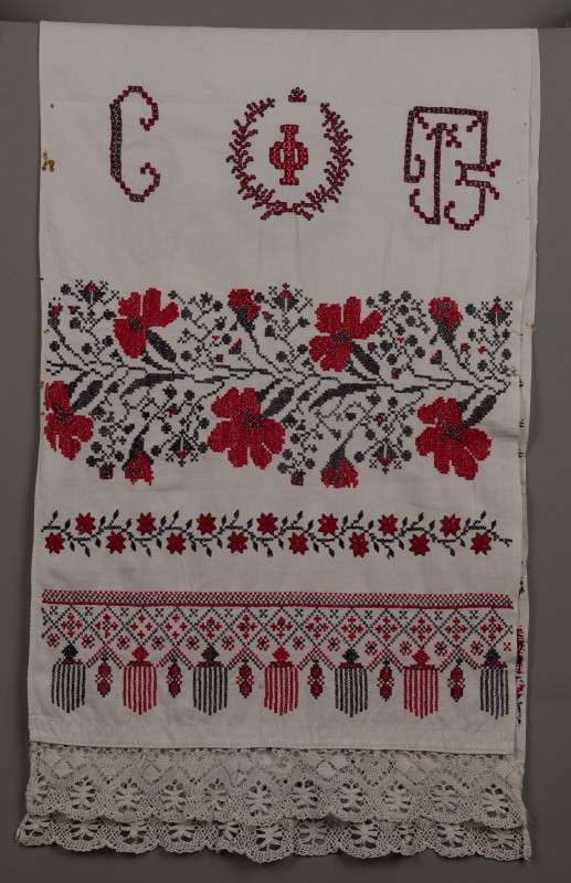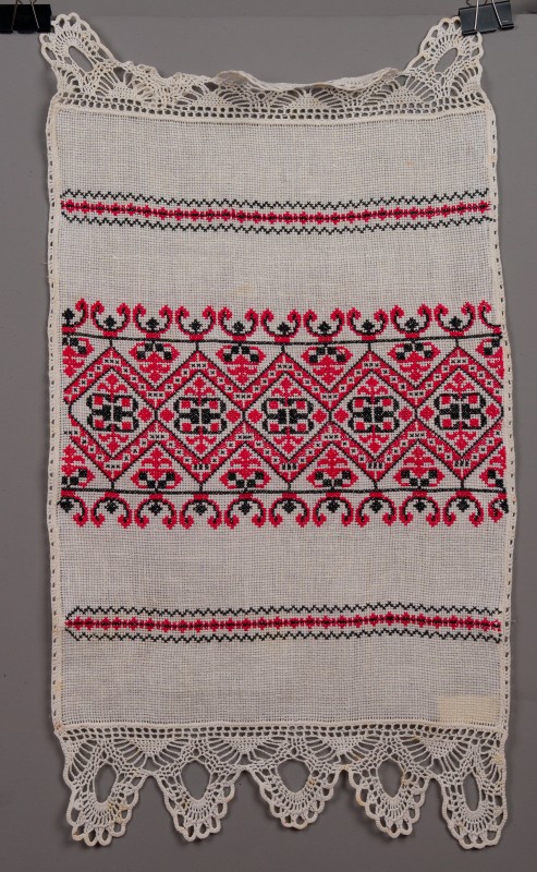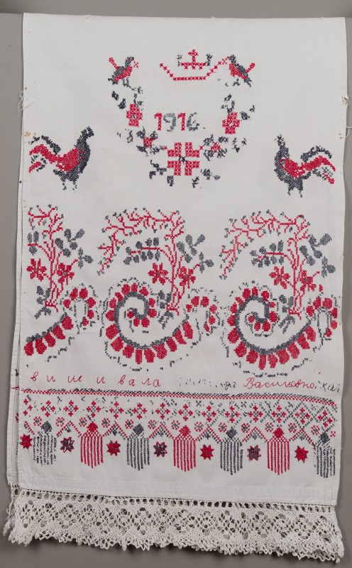 Жилет- коротка безрукавка з чорної вовняної тканини, вишита гладдю і стеблистим швом, зображує стибілізовані квіти нитками, муліне зеленого, червоного, жовтого, синього кольорів. Застібка на ліву сторону на сім металевих кнопок. Підкладка- бавовна сірого кольру. Початок ХХ століття.
