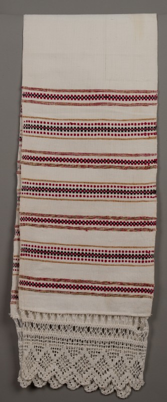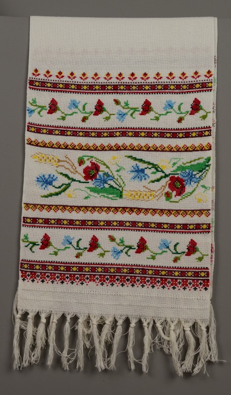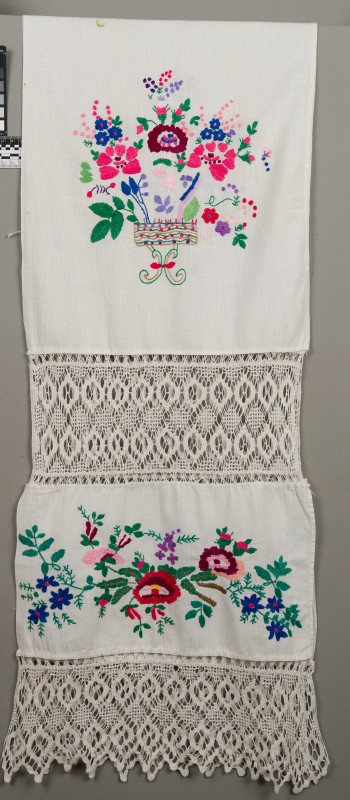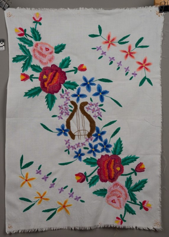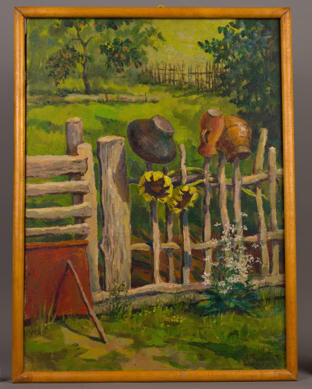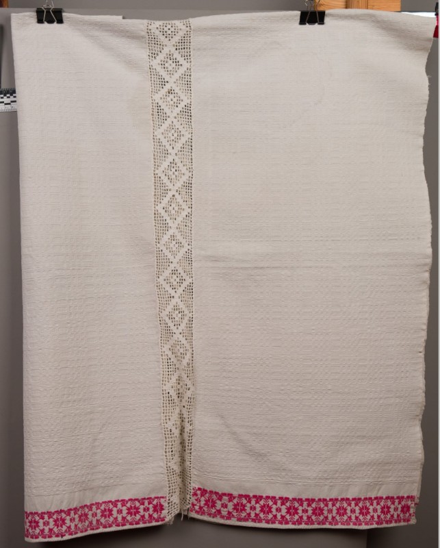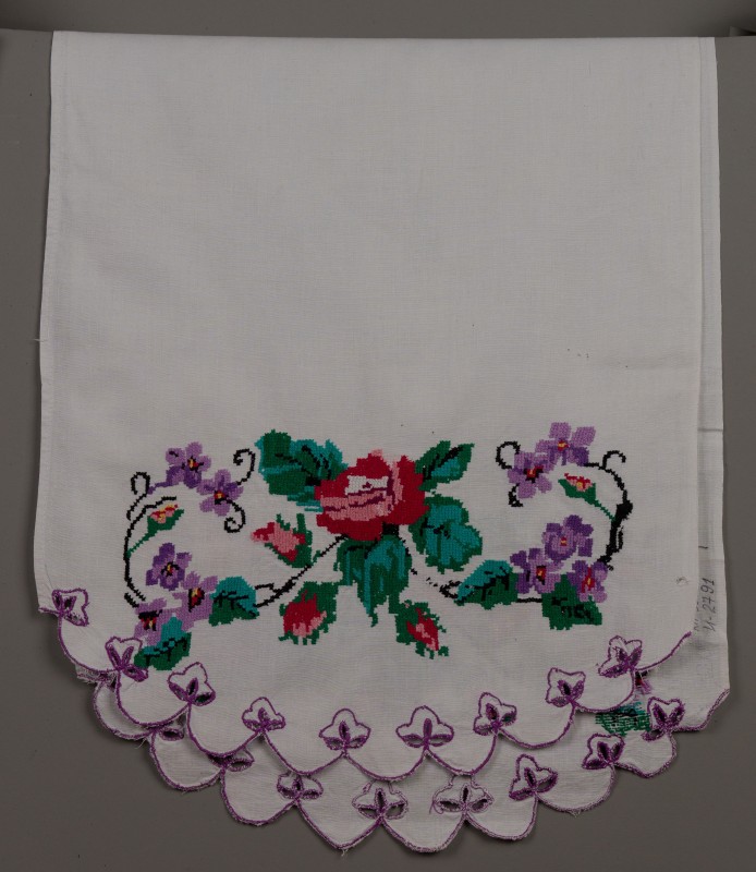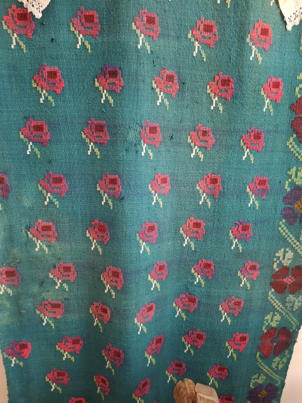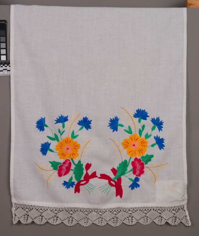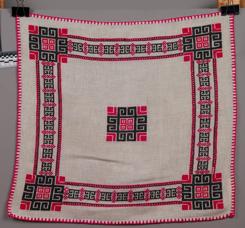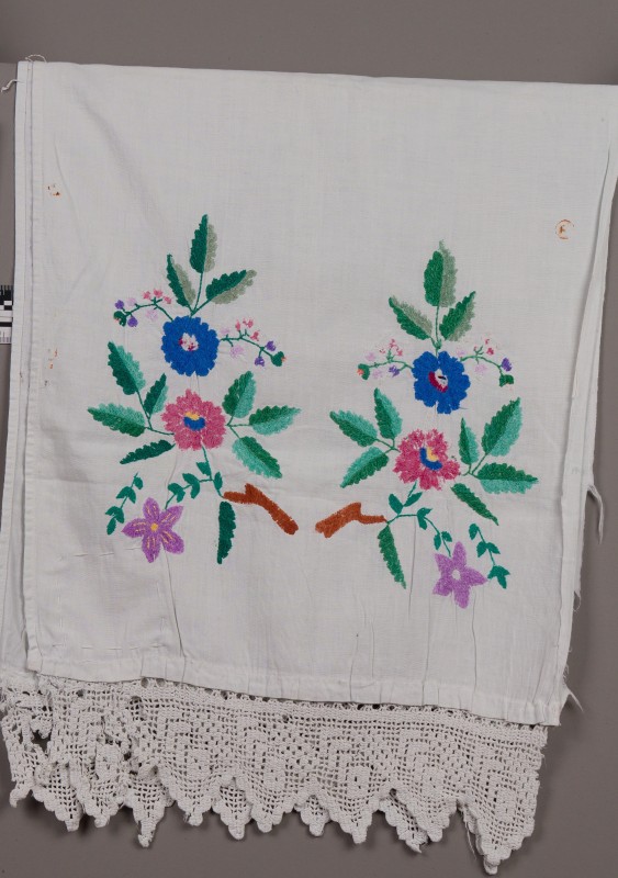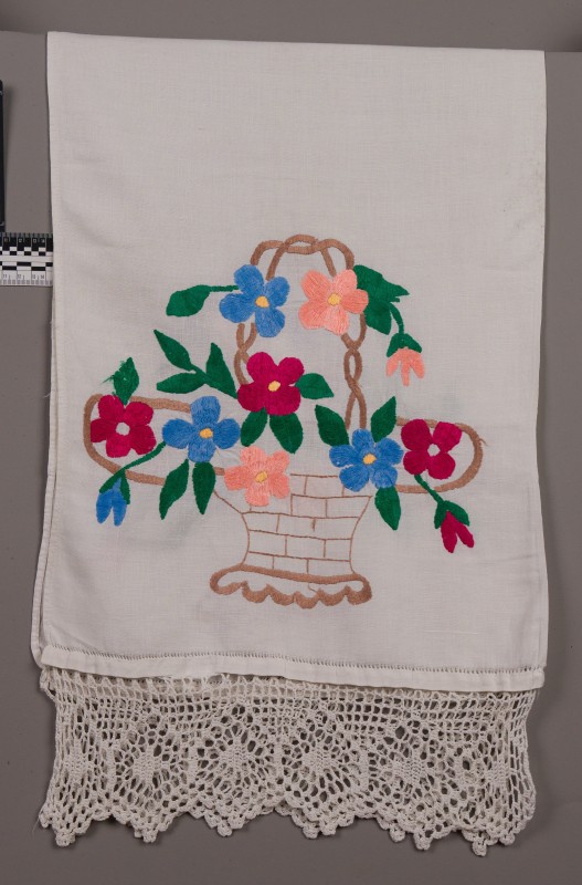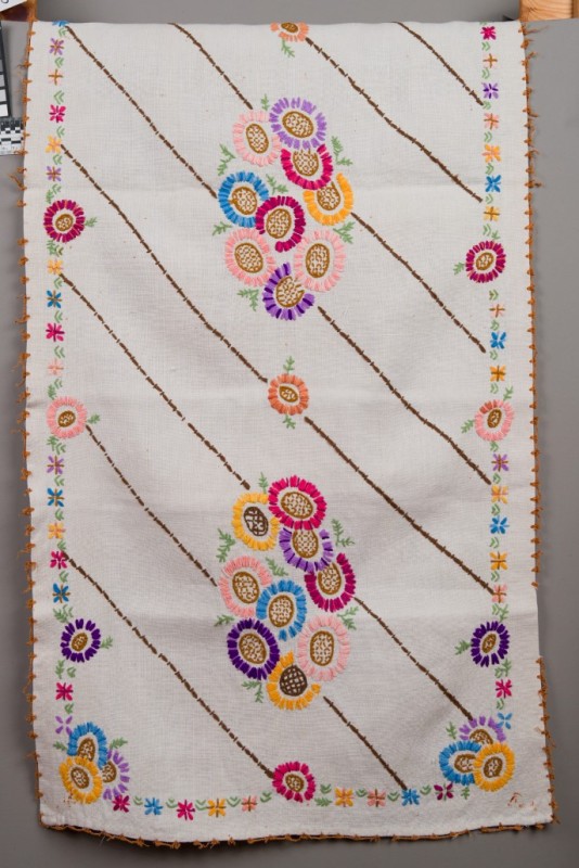 Жилет- коротка безрукавка з чорної вовняної тканини, вишита гладдю і стеблистим швом, зображує стибілізовані квіти нитками, муліне зеленого, червоного, жовтого, синього кольорів. Застібка на ліву сторону на сім металевих кнопок. Підкладка- бавовна сірого кольру. Початок ХХ століття.