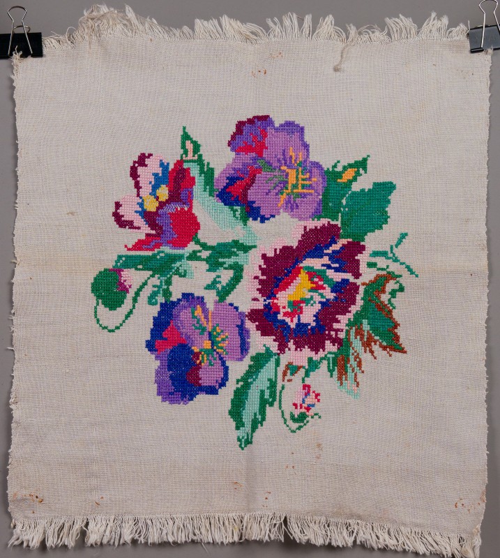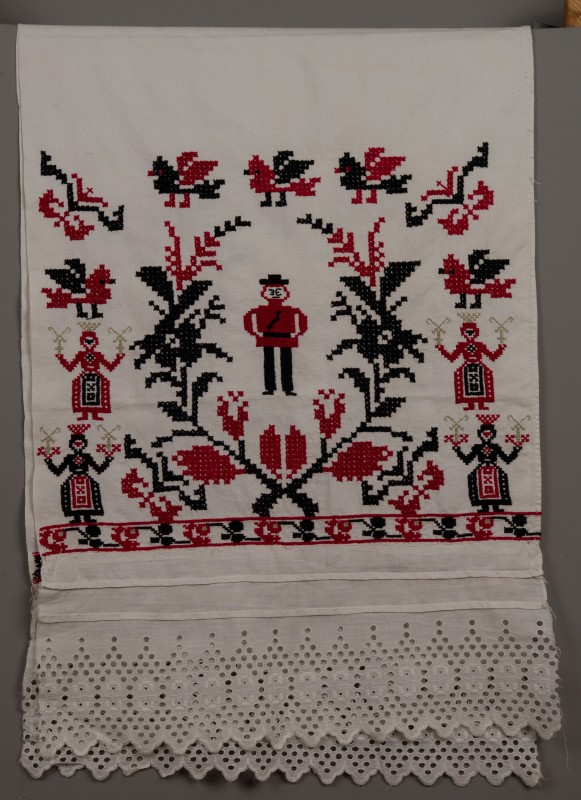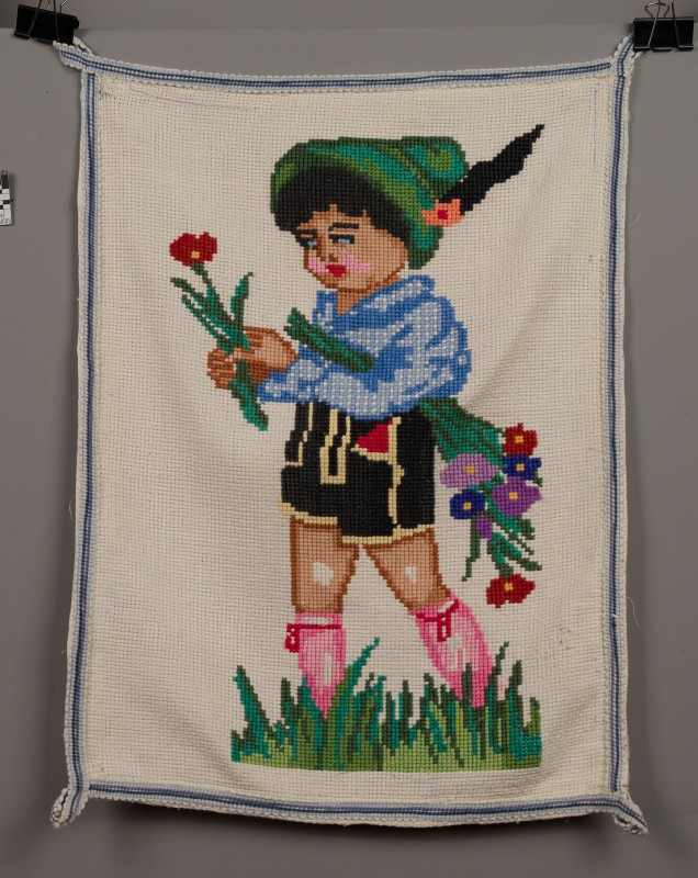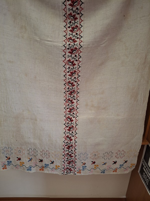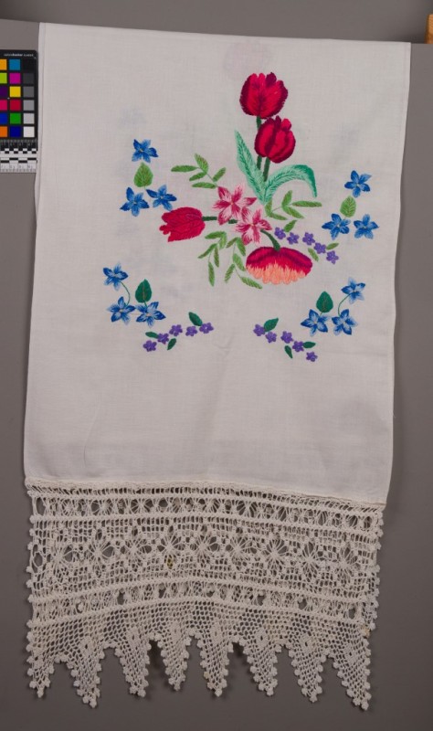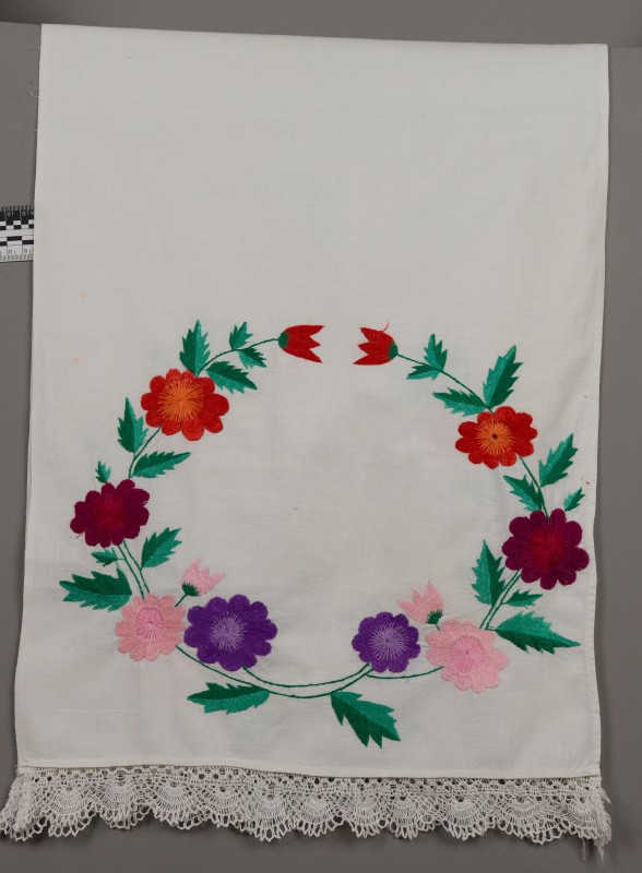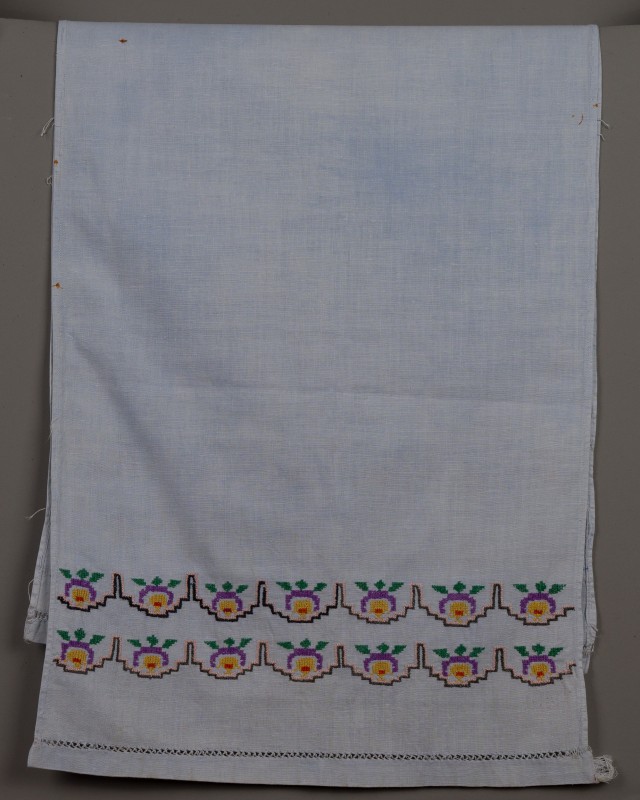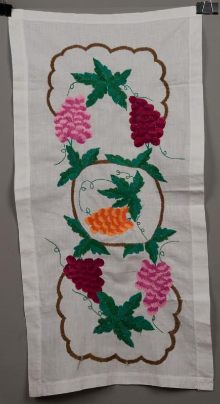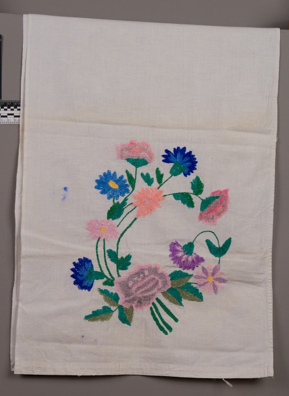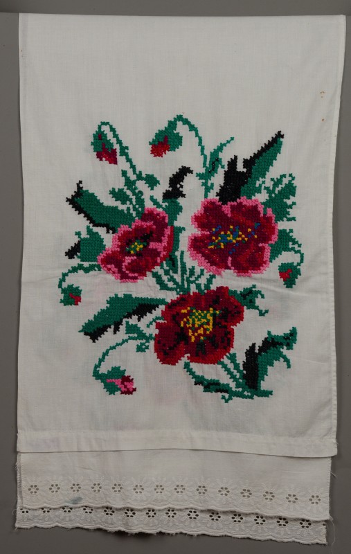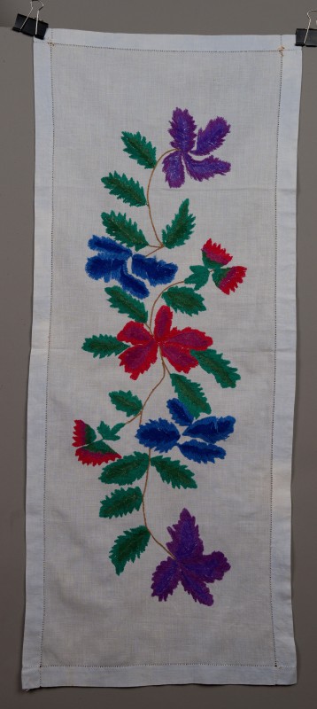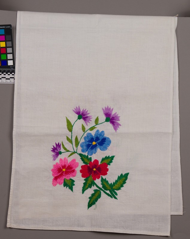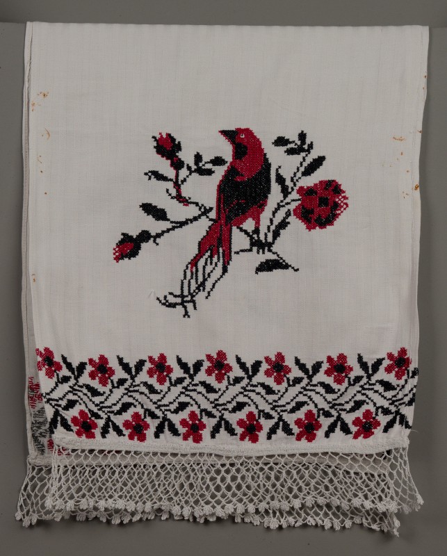 Жилет- коротка безрукавка з чорної вовняної тканини, вишита гладдю і стеблистим швом, зображує стибілізовані квіти нитками, муліне зеленого, червоного, жовтого, синього кольорів. Застібка на ліву сторону на сім металевих кнопок. Підкладка- бавовна сірого кольру. Початок ХХ століття.