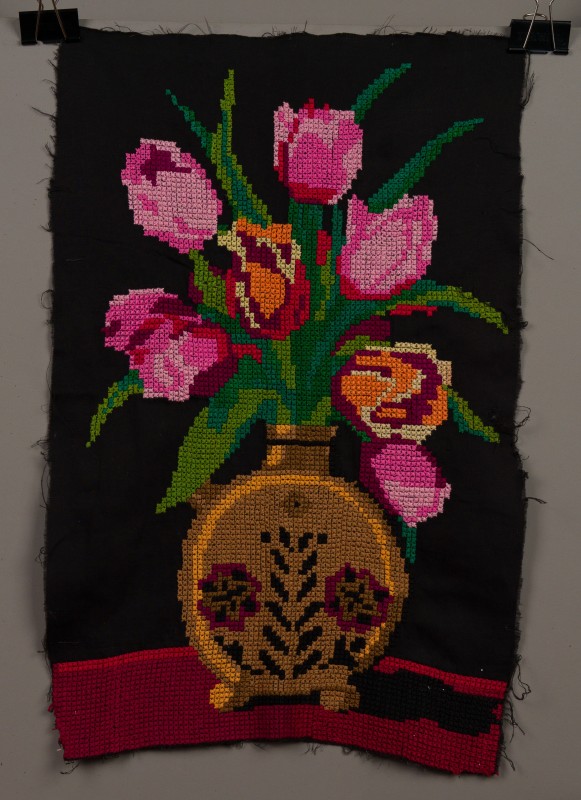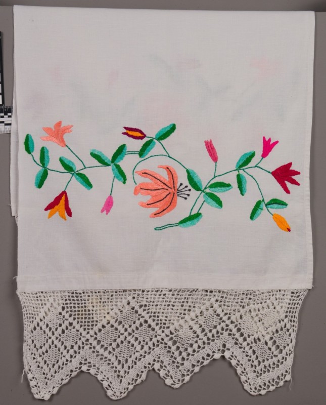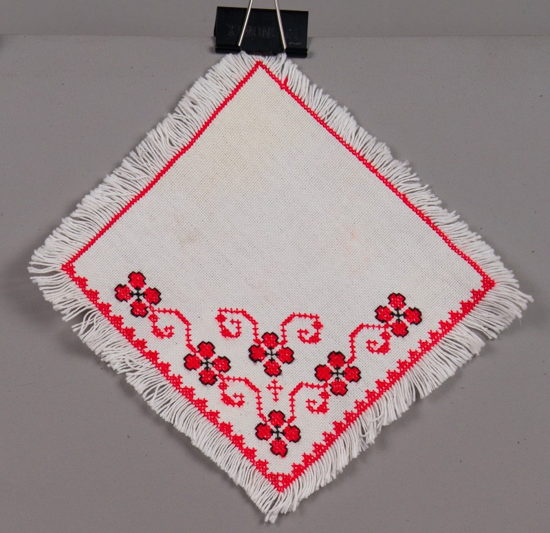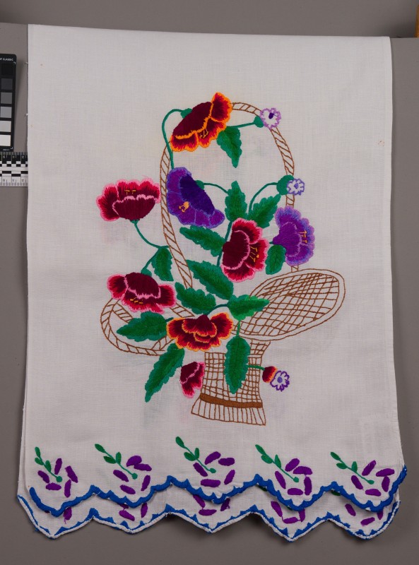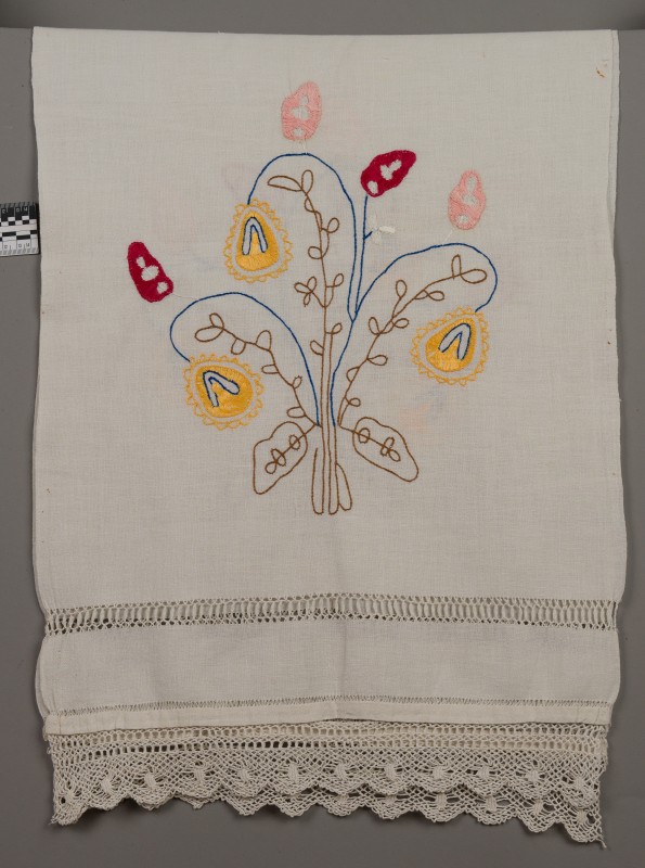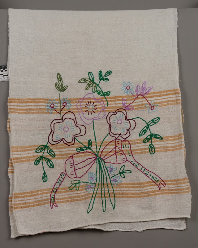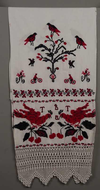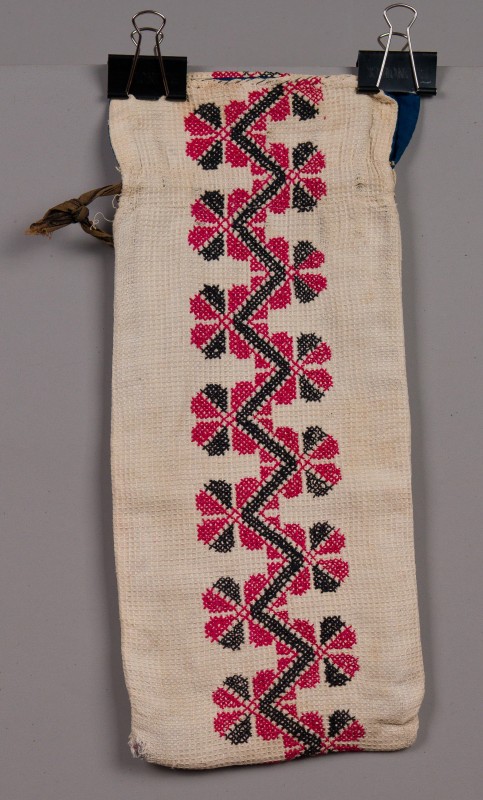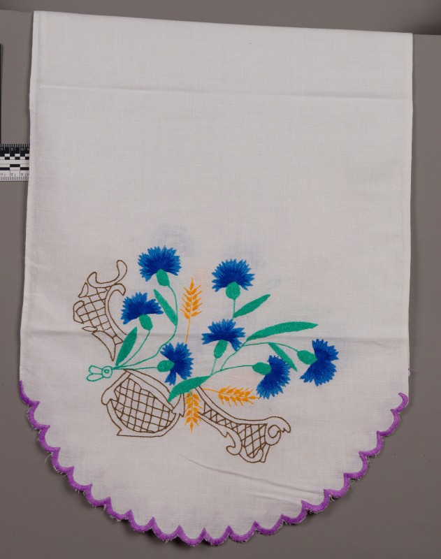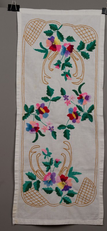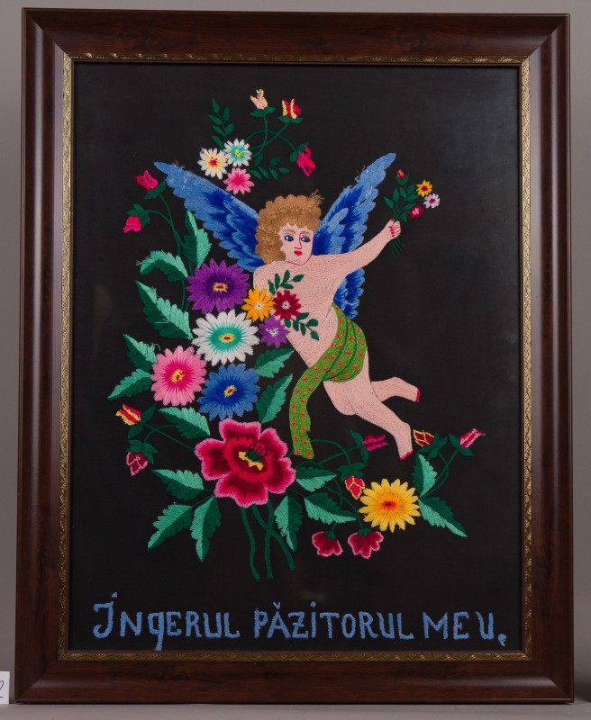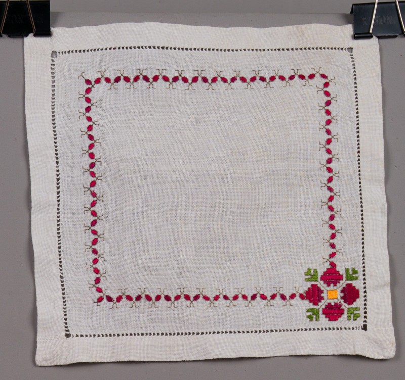 Жилет- коротка безрукавка з чорної вовняної тканини, вишита гладдю і стеблистим швом, зображує стибілізовані квіти нитками, муліне зеленого, червоного, жовтого, синього кольорів. Застібка на ліву сторону на сім металевих кнопок. Підкладка- бавовна сірого кольру. Початок ХХ століття.