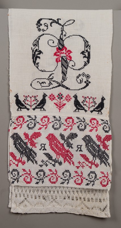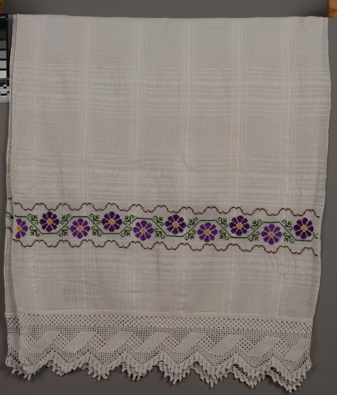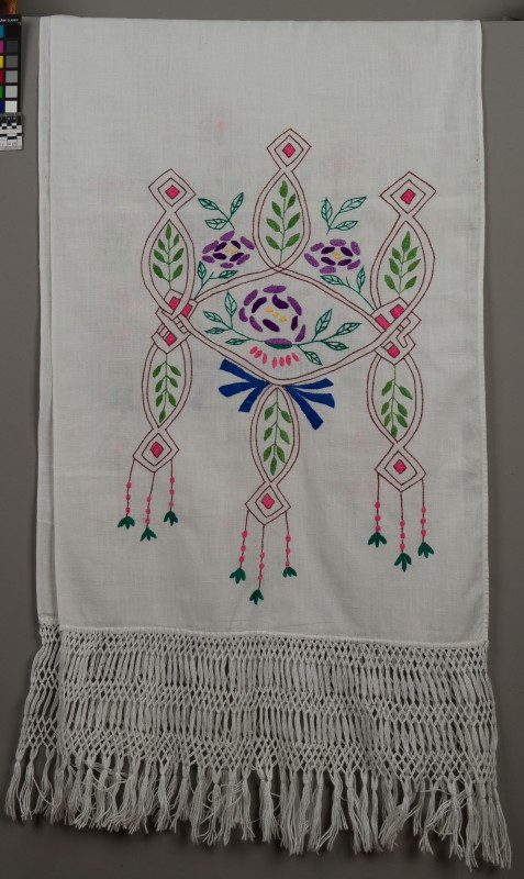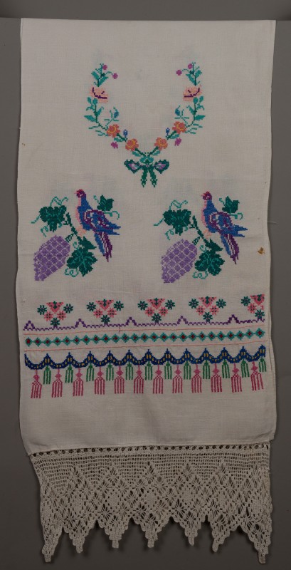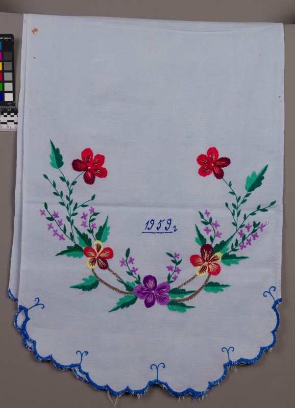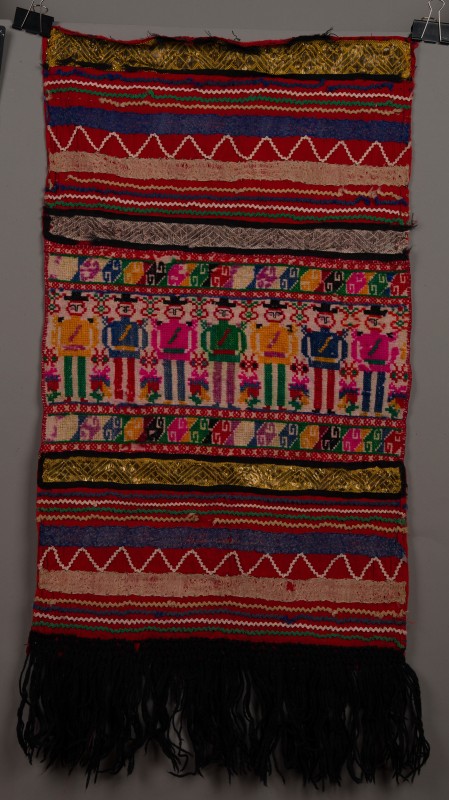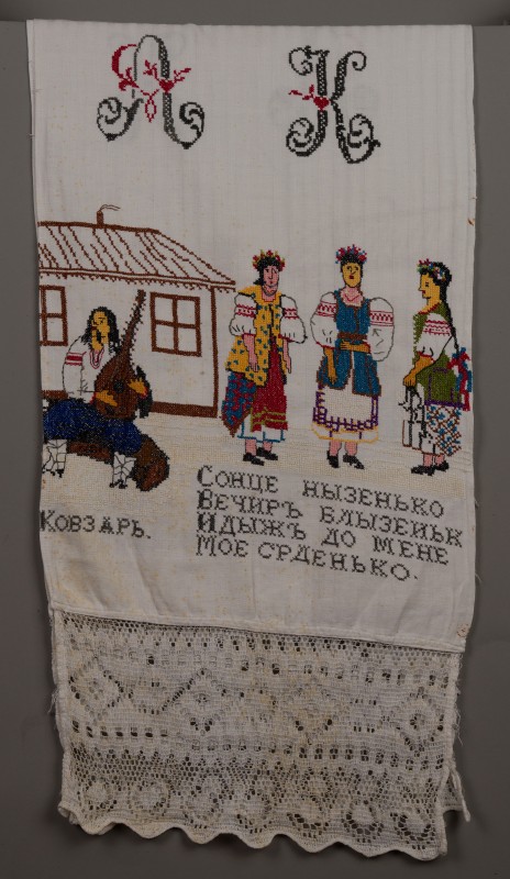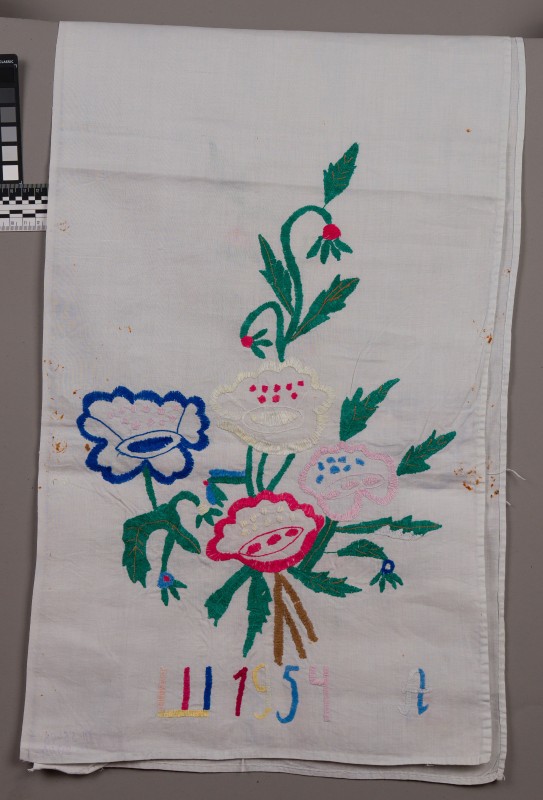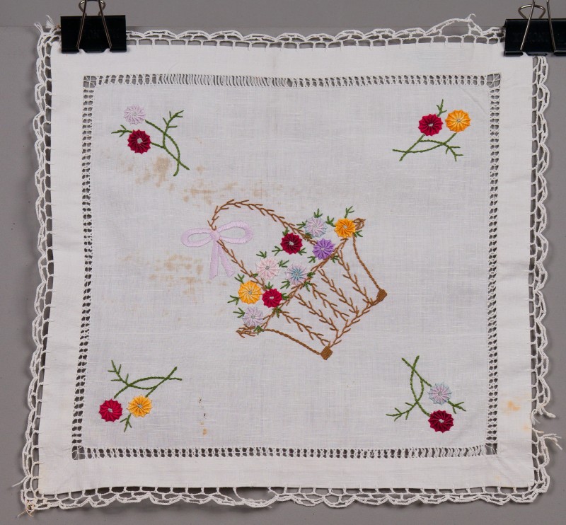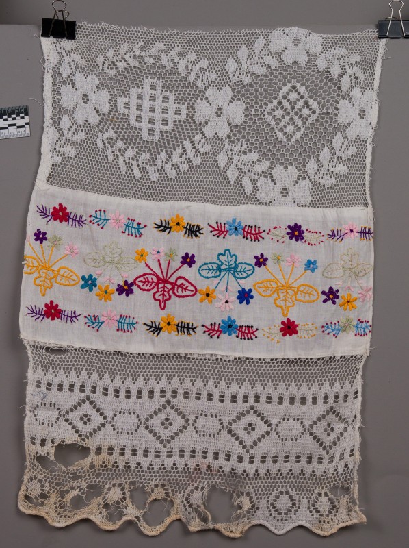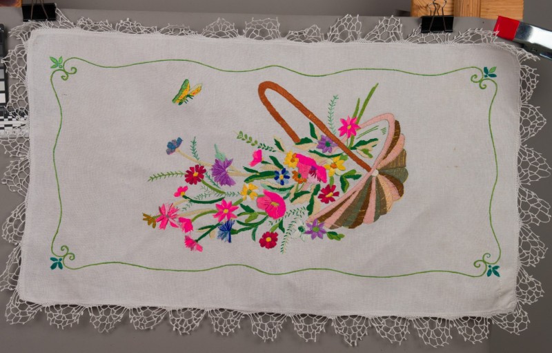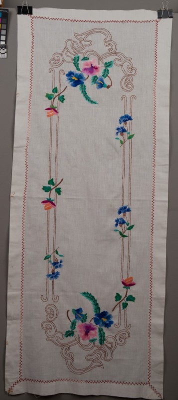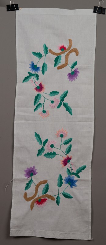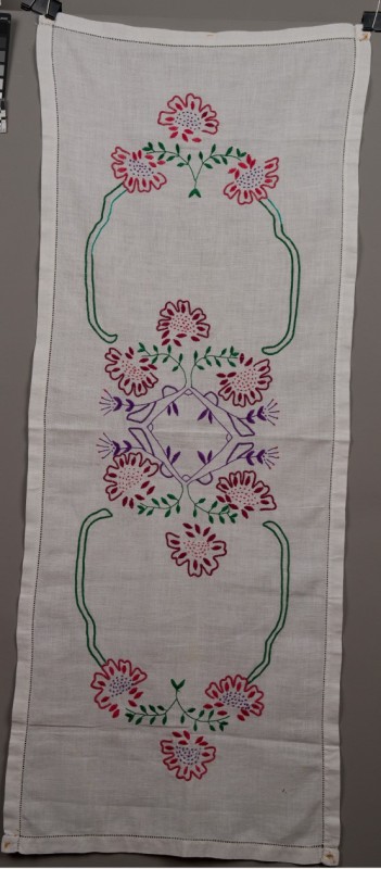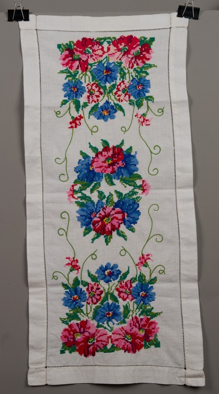 Жилет- коротка безрукавка з чорної вовняної тканини, вишита гладдю і стеблистим швом, зображує стибілізовані квіти нитками, муліне зеленого, червоного, жовтого, синього кольорів. Застібка на ліву сторону на сім металевих кнопок. Підкладка- бавовна сірого кольру. Початок ХХ століття.