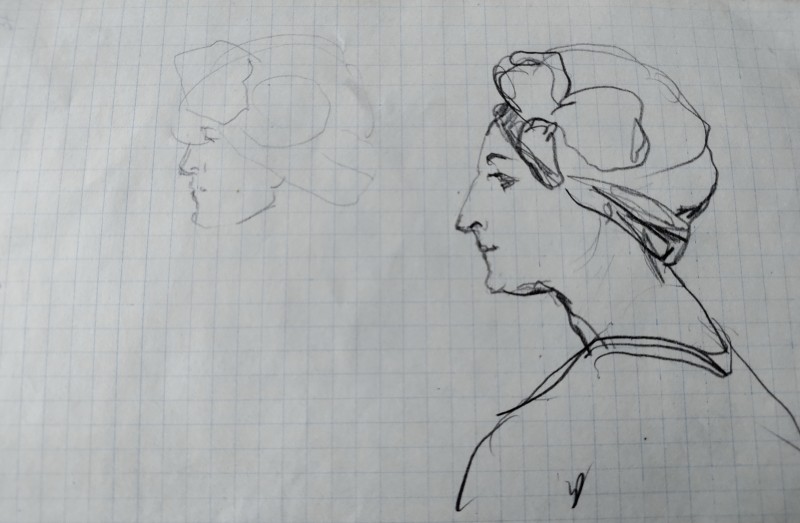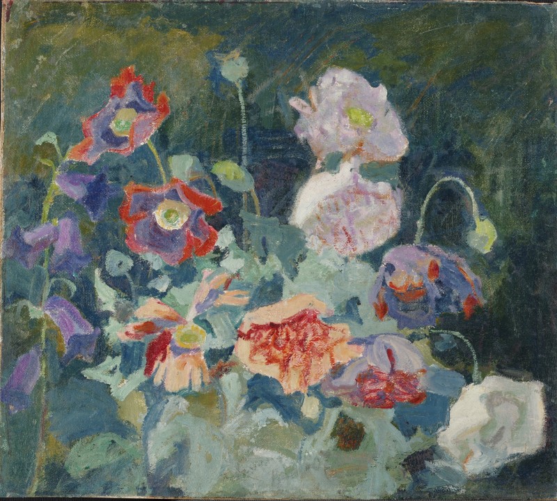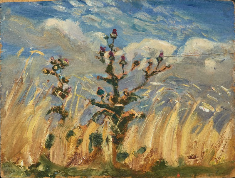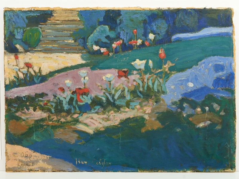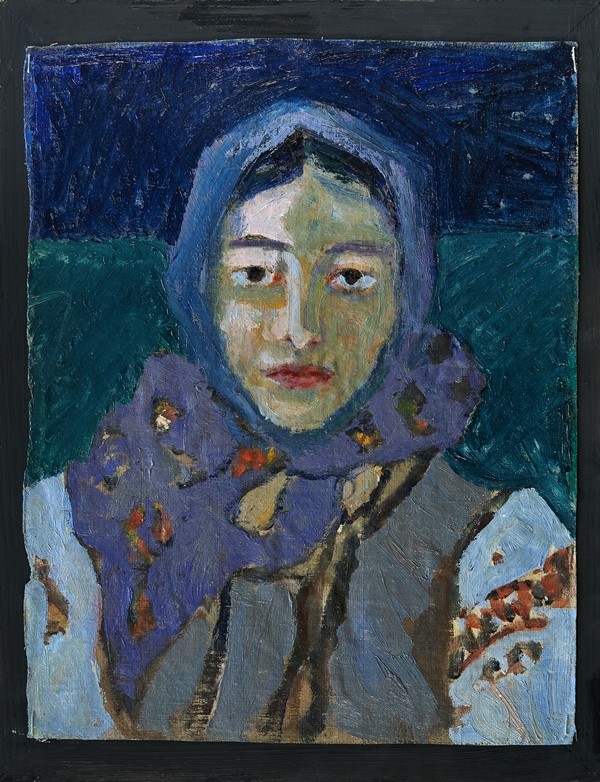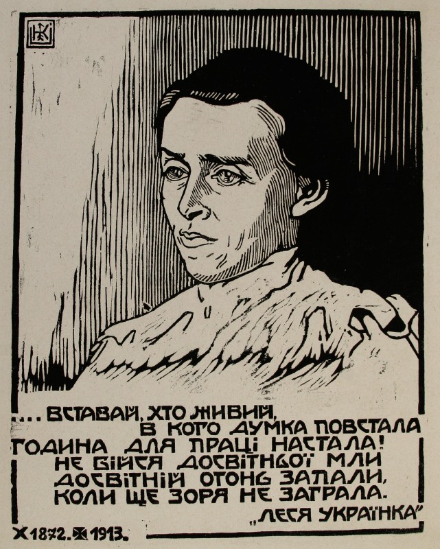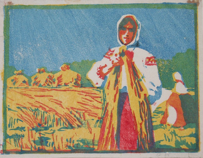 Молода світловолоса жінка сидить, злегка повернена вліво, нахилившить над книжкою, яку тримає на колінах. Одягнена у рожеву комбінацію на бретельках й синю спідницю з незакритим замком на стегні. На тлі позаду жінки – чорний килим з барвистими квітами. Загальний колорит теплий, в жовто-рожево-синіх відтінках. Внизу зліва авторський підпис: Gloutchenko 32.