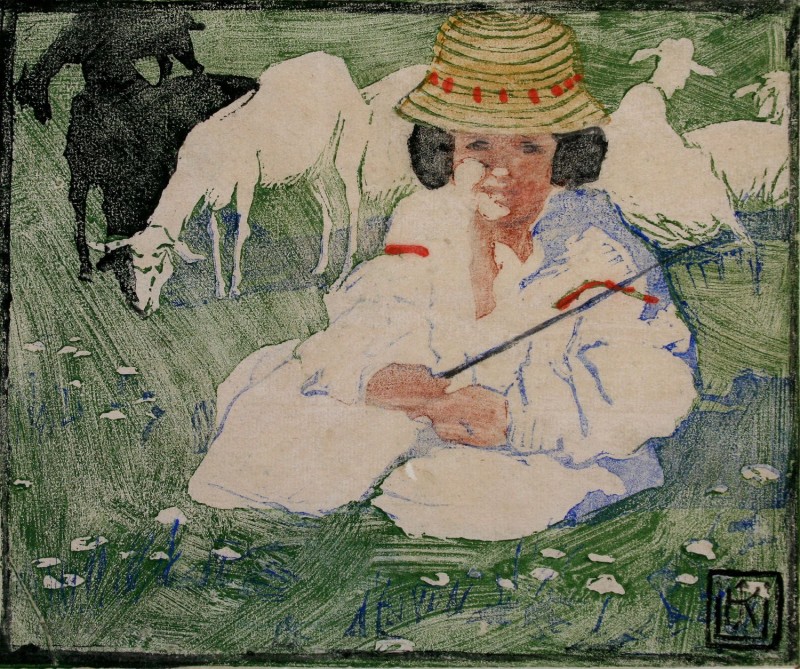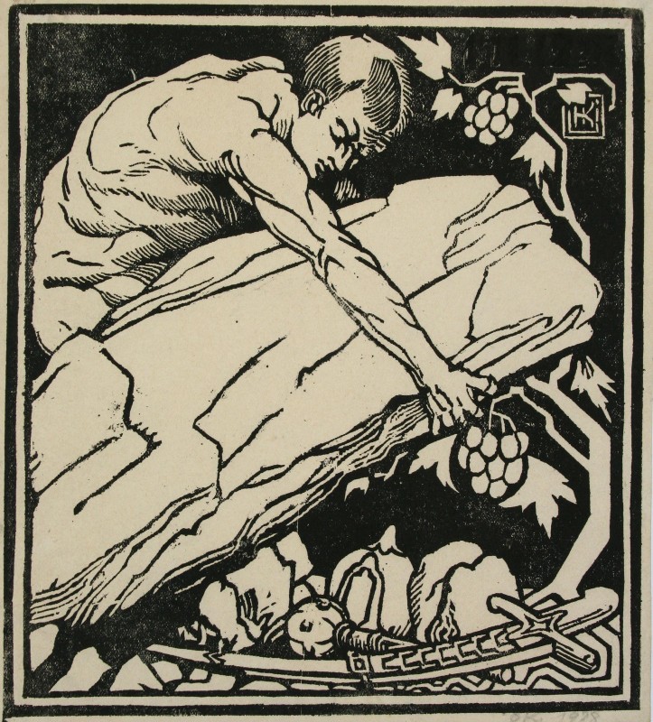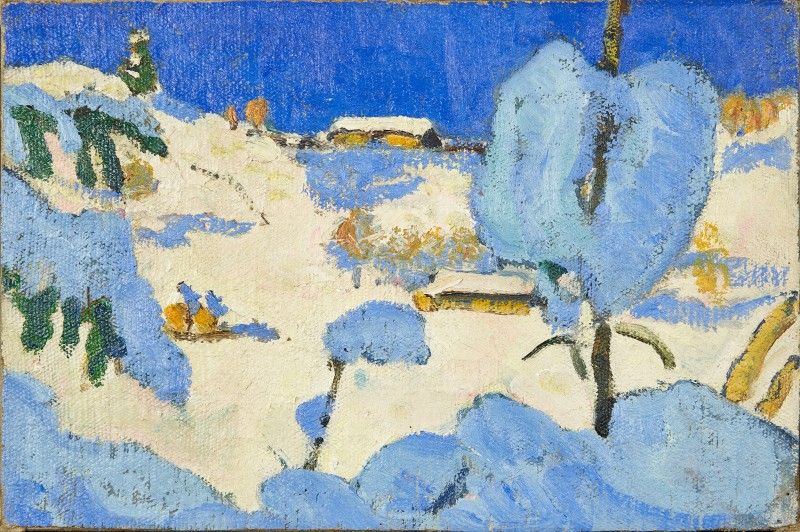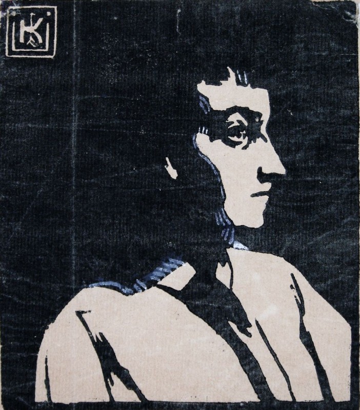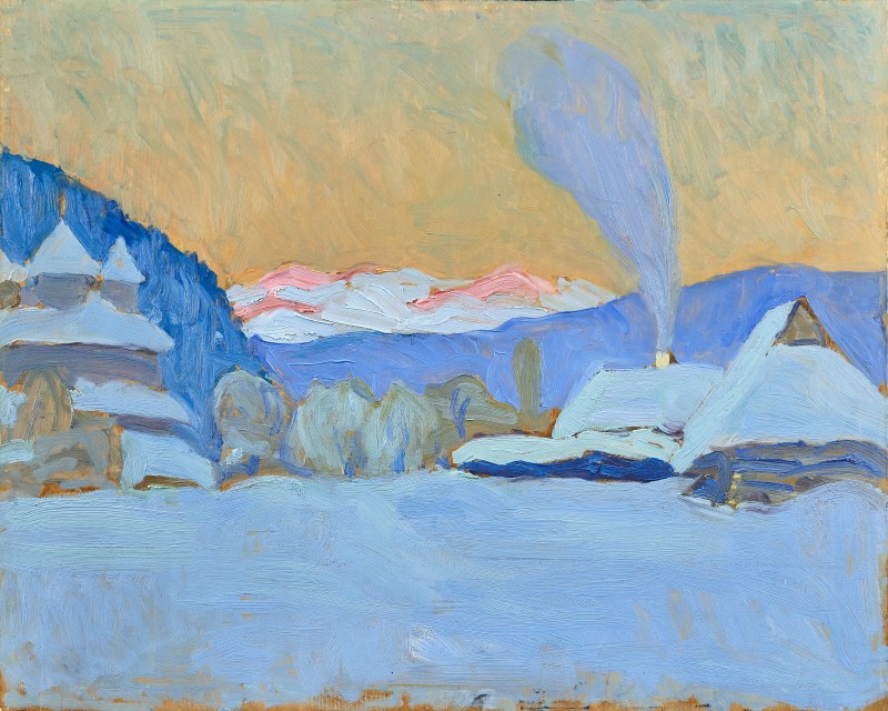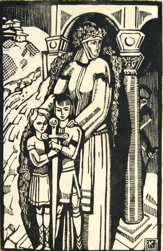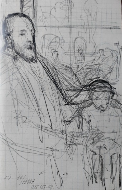 Молода світловолоса жінка сидить, злегка повернена вліво, нахилившить над книжкою, яку тримає на колінах. Одягнена у рожеву комбінацію на бретельках й синю спідницю з незакритим замком на стегні. На тлі позаду жінки – чорний килим з барвистими квітами. Загальний колорит теплий, в жовто-рожево-синіх відтінках. Внизу зліва авторський підпис: Gloutchenko 32.